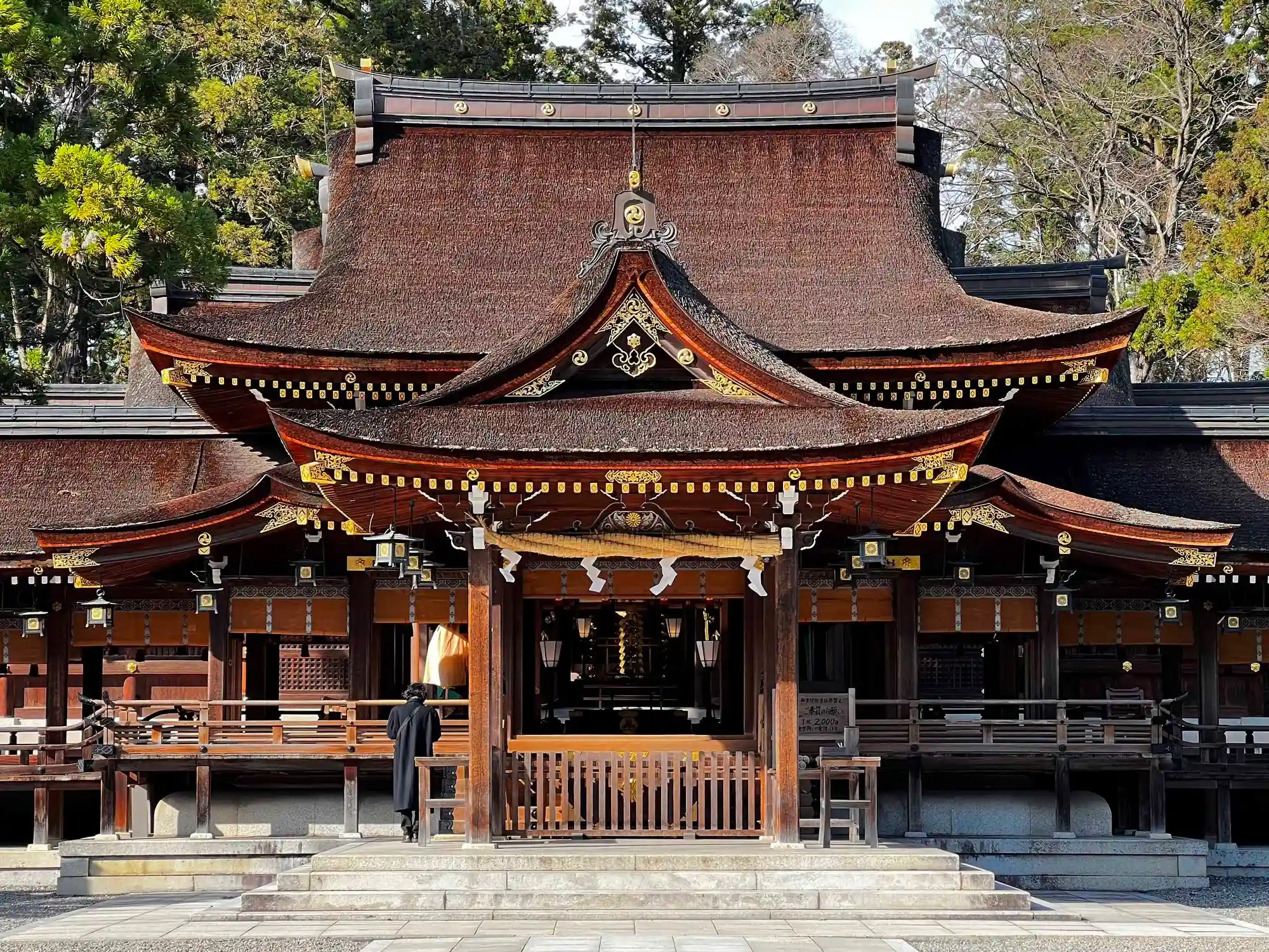 手水舎近くから見た<社殿>全景。拝殿両側の翼殿が大きく豪壮な構え。