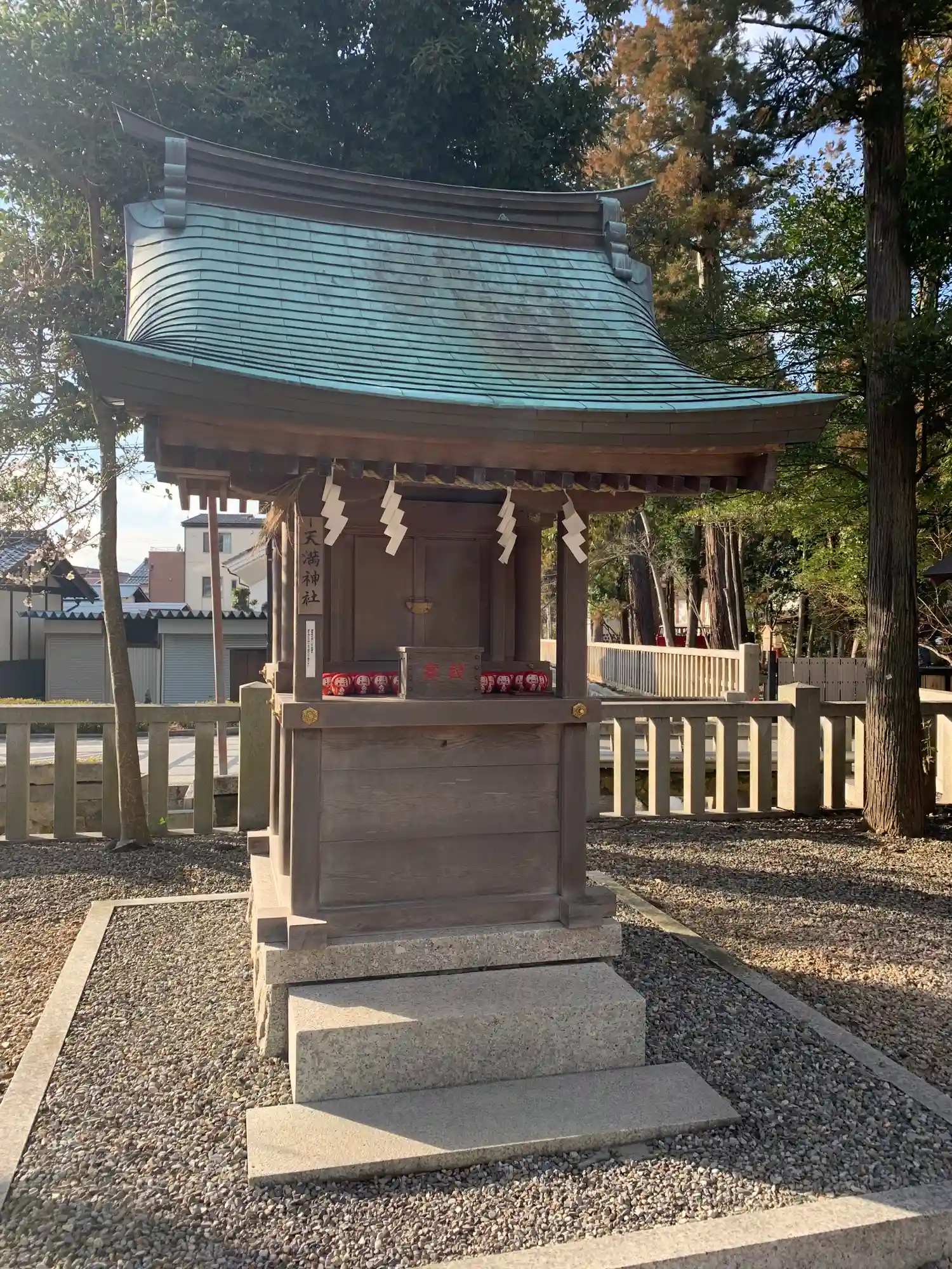 神橋を越えた左側で、神橋に向かって建っている<天満神社>。