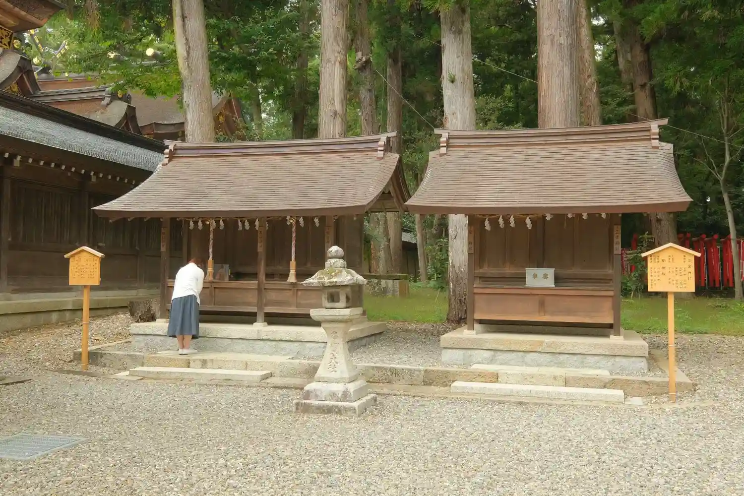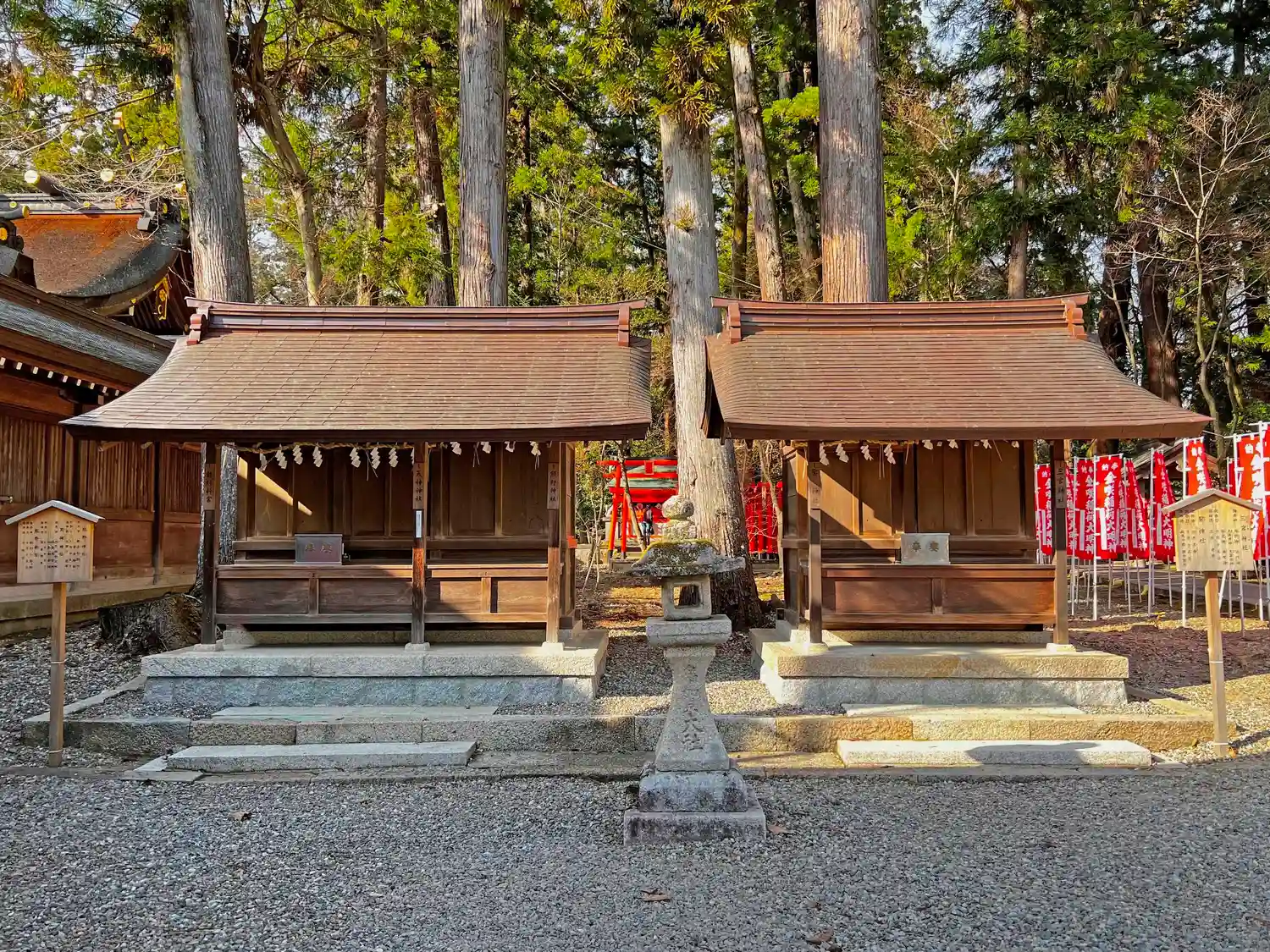 右側翼殿の右側にある<熊野神社>(左)と<三宮神社>(右)。この後、境内の北東側を見て廻る。