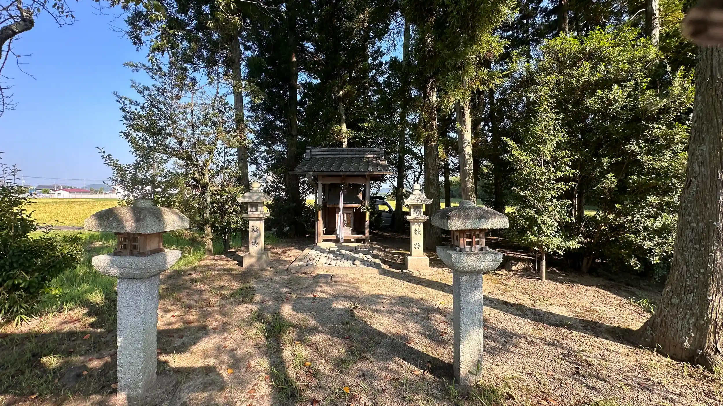 御祭神 菅原道真公。本殿 一間社流造の小さな神社です、小さな集落の外れに鎮座されています。境内横の石仏?にはかわいい青のおそろいのエプロンがつけてありました