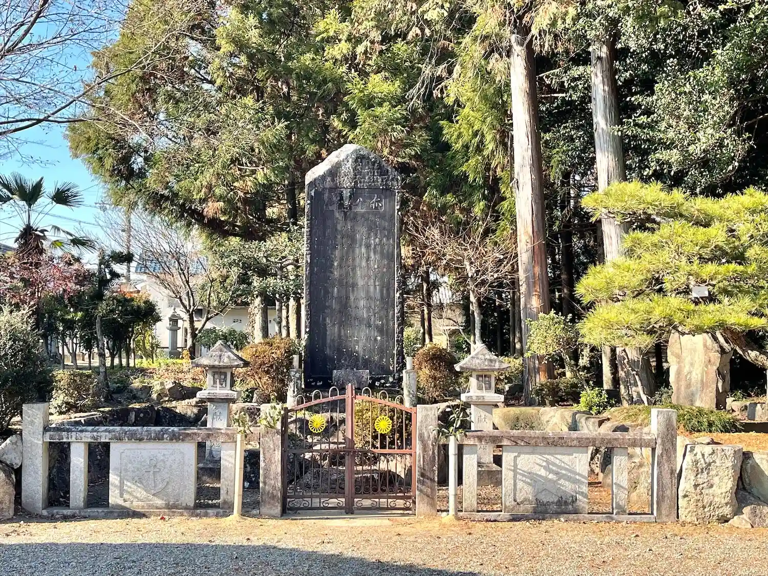 神社の周りに石灯籠が並んでいます