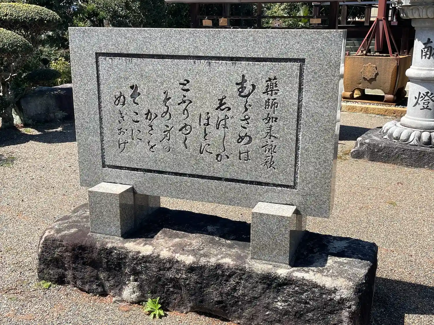 境内東側に、南北朝時代の石造浮彫の薬師三尊仏(中央は薬師如来、脇侍は日光、月光両菩薩)があります。