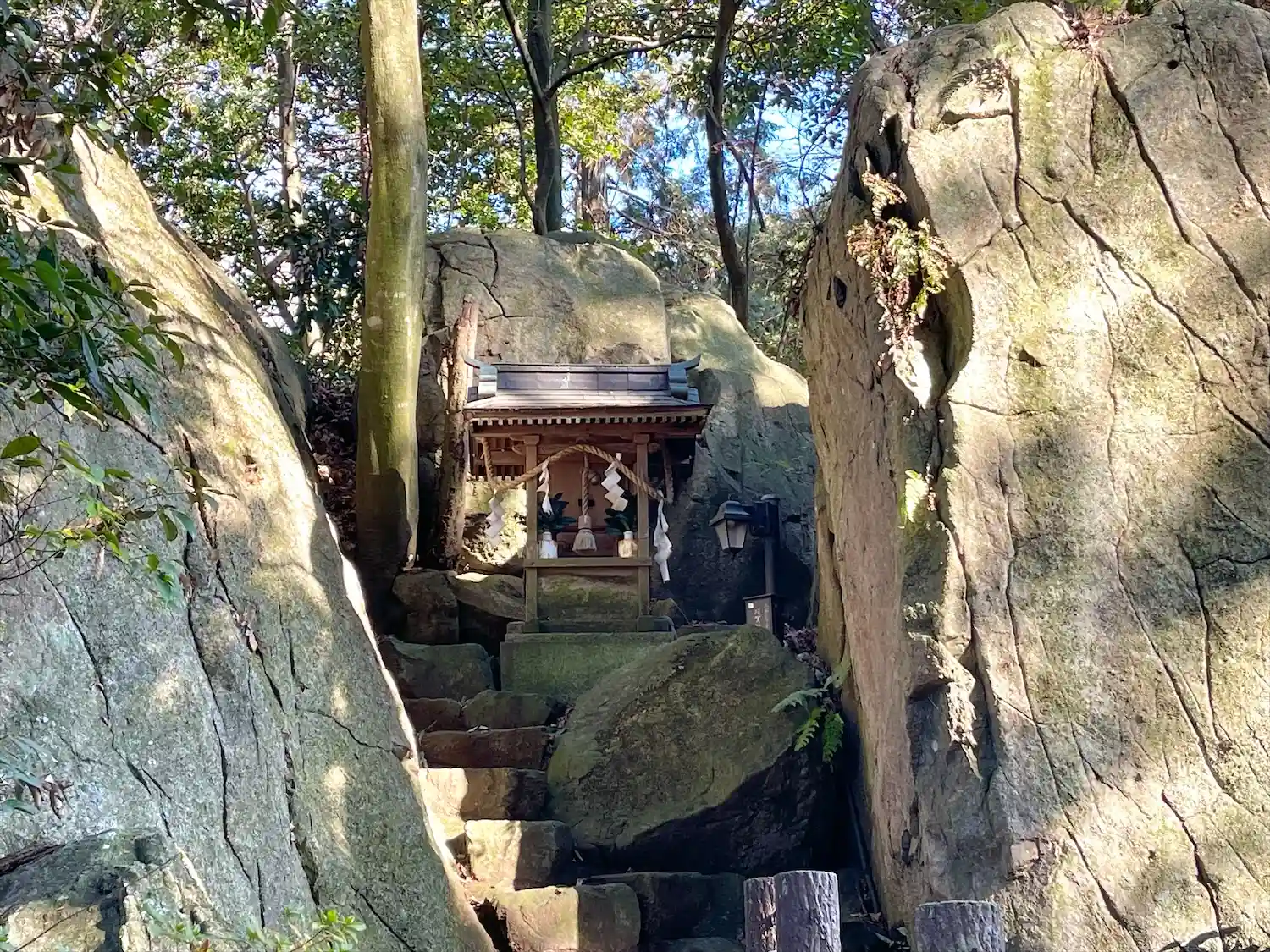 拝殿左側に社務所(無人)、右手に境内社で磐座がある。