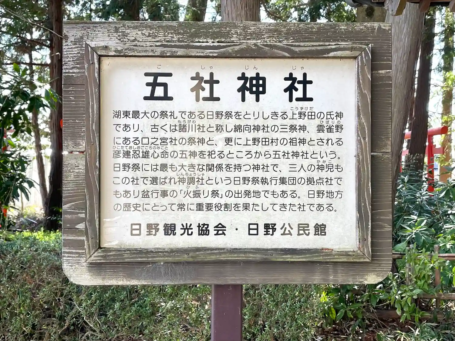 日野祭には最も大きな関係を持つ神社で、三人の神児もこの社で選ばれ、神調社という日野祭執行集団の拠点社です。盆行事の「火振り祭」の出発地でもあります。日野地方の歴史にとって常に重要役割を果たしてきた社です。