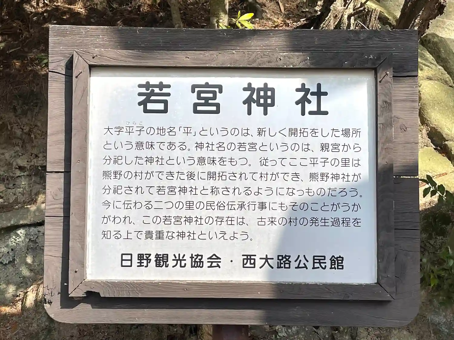 神社のある平子の里は熊野の村ができた後に開拓されて村ができ、熊野神社が分祀されて若宮神社と称されるようになりました。
