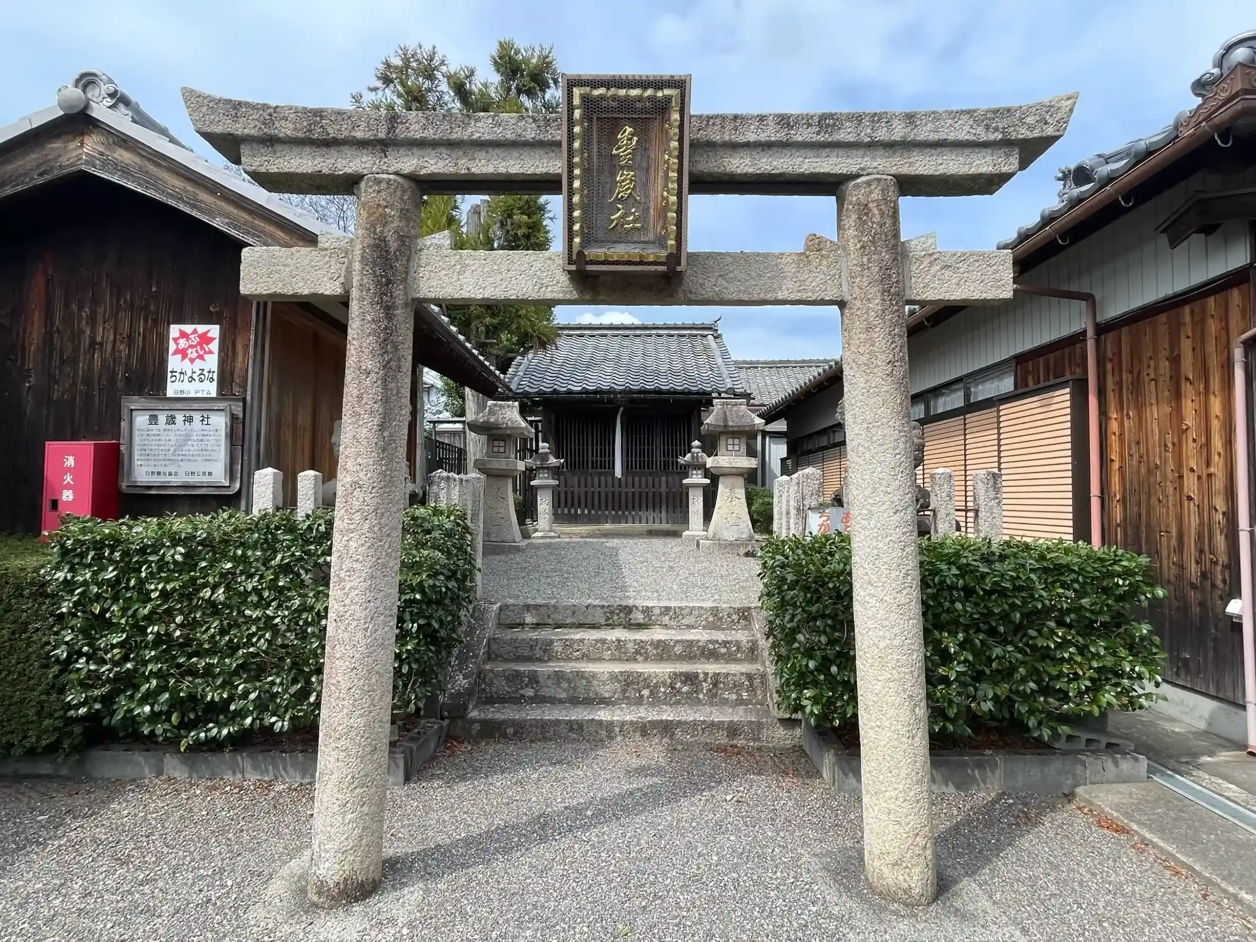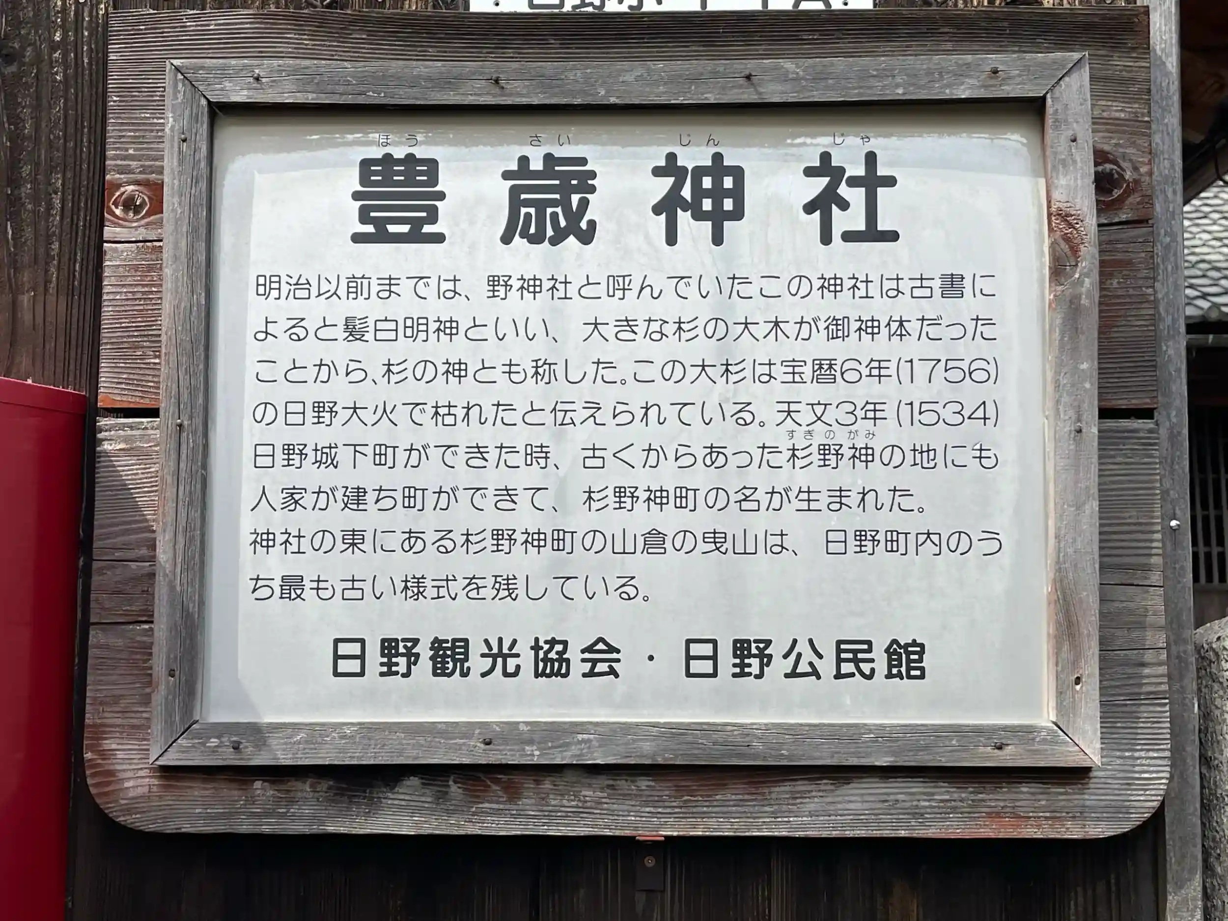 日野観光協会駐車場に車を停めて散策しながらまわりました。創祀年代は不詳です。明治以前は野神社また杉之神と呼ばれていました。元禄17年に社殿が建造され、明治4年豊歳神社と改称されました。