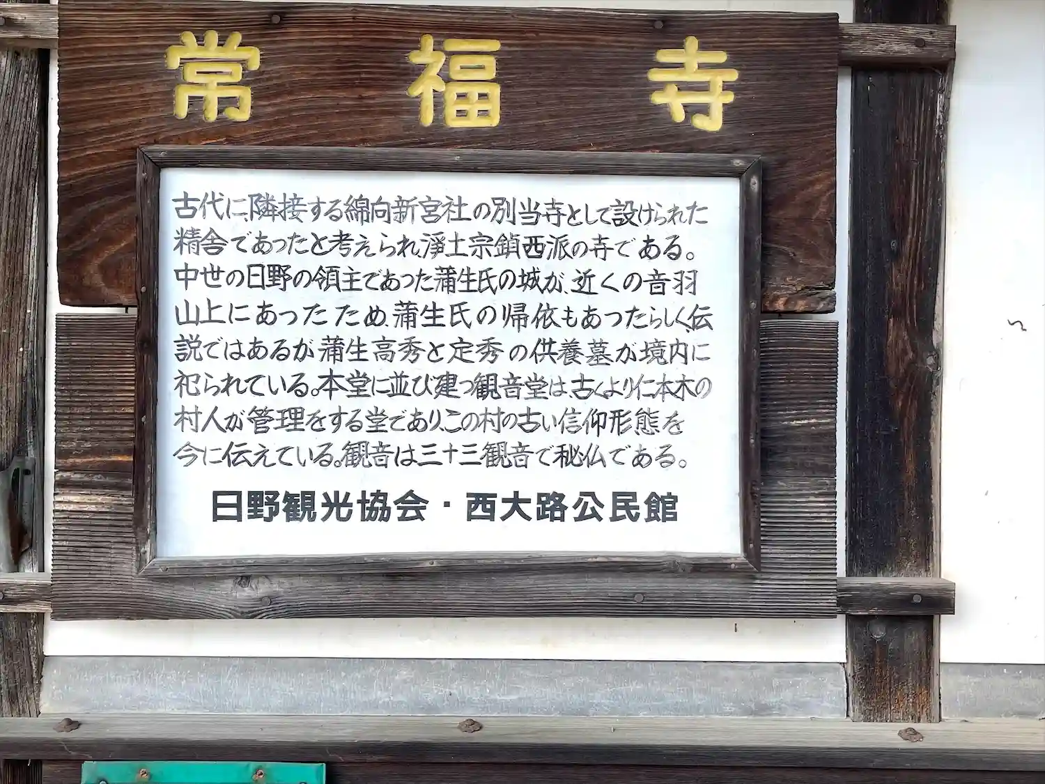 中世の日野の領主であった蒲生氏の城が、近くの音羽山上にあったため、蒲生氏の帰依もあったらしく、伝説ではあるが蒲生高秀と定秀の供養墓が境内に祀られています。本堂に並び建つ観音堂は、きくより仁本木の村人が管理をする堂でありこの村の古い信仰形態を今に伝えています。観音は日野町三十三観音で秘仏です。