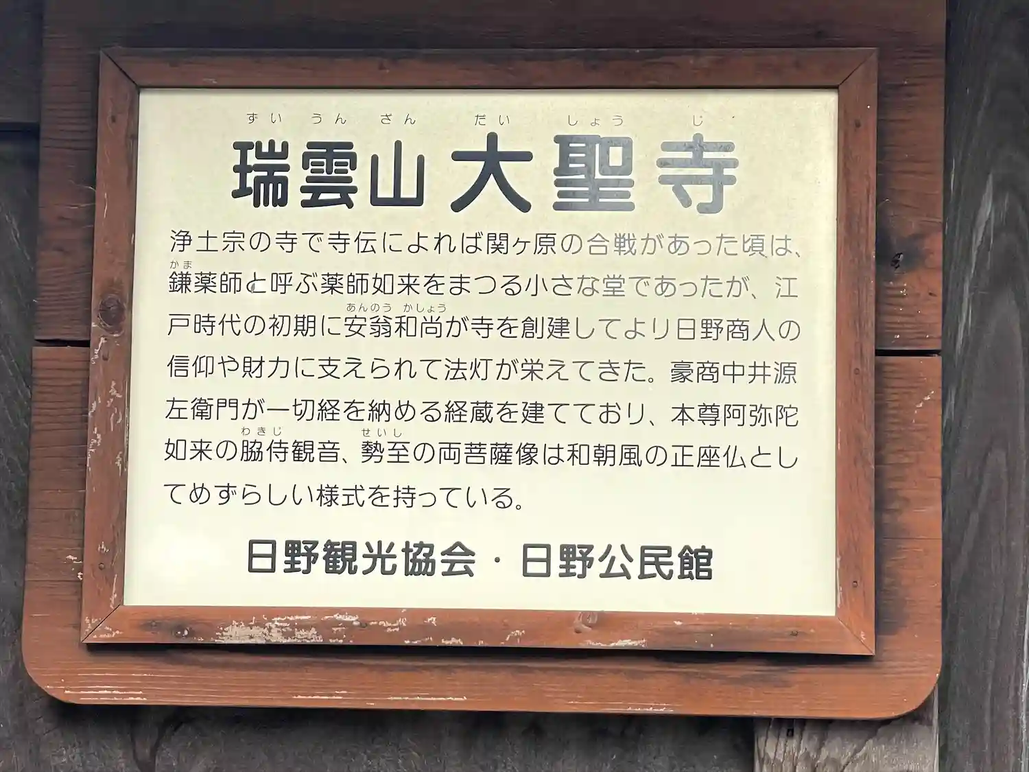 寺伝によれば関ヶ原の合戦があった頃は、鎌薬師と呼ぶ薬師如来をまつる小さな堂であったが、江戸時代の初期に安翁和尚が寺を創建してより日野商人の信仰や財力に支えられて法灯が栄えてきました。豪商中井源左衛門が一切経を納める経蔵を建てており、本尊阿弥陀如来の脇侍観音、勢至の両菩薩像は和朝風の正座仏としてめずらしい様式を持っています。