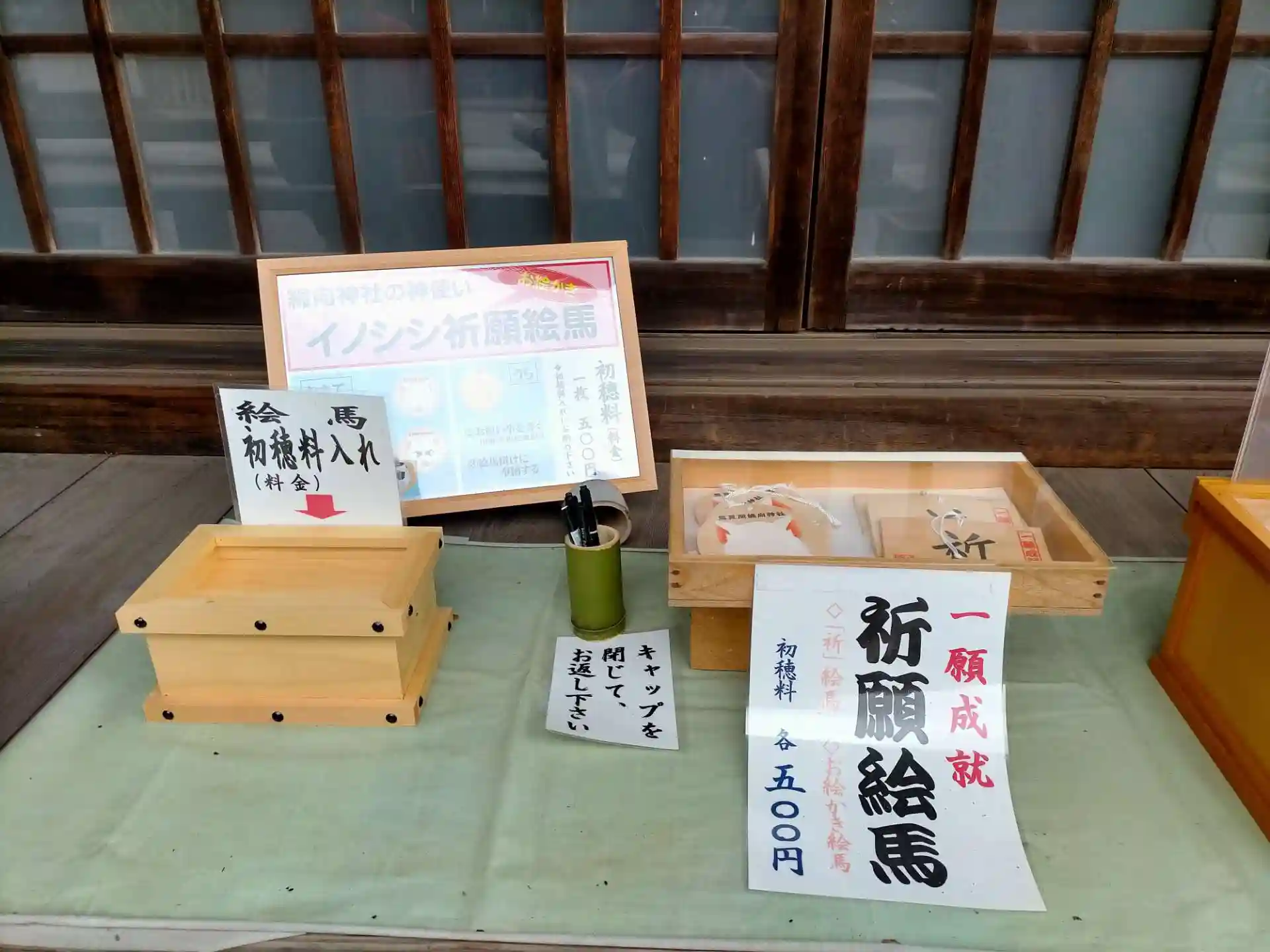色々な表情の顔の猪の絵馬が沢山掛けてありました。