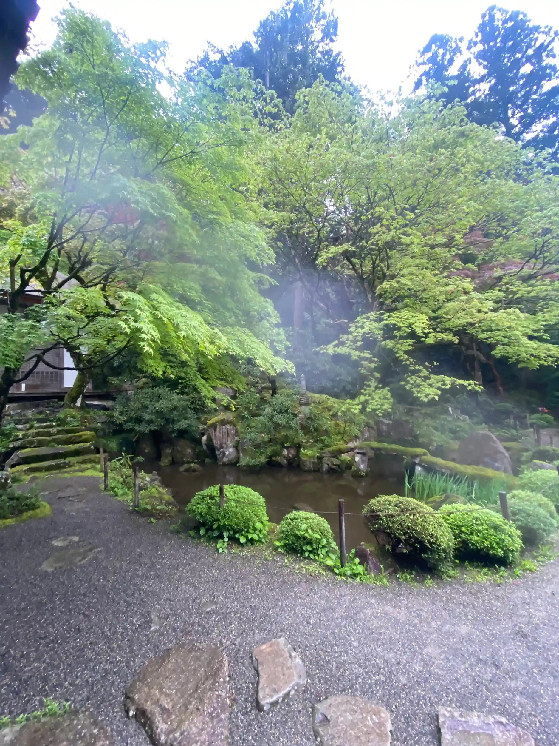 滋賀県湖東三山の二つ目は、金剛輪寺。神仏霊場にて参拝致しました。雨が小降りでしたが、新緑のもみじも雨に濡れて良い感じです。本堂までの山道の石段には参りました😓湖東三山の庭園は一見の価値あり、すごく癒される🤗