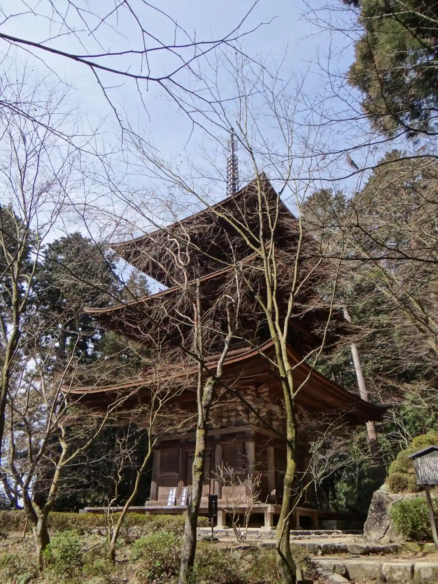 この参道が長かったおかげで「信長の焼き討ち」から、本堂・三重塔ともに難を逃れたとのことです。本堂には、古い仏像が並びます。鎌倉時代からの三重塔は老朽化で崩壊寸前であったものが蘇ったとお聞きしました。