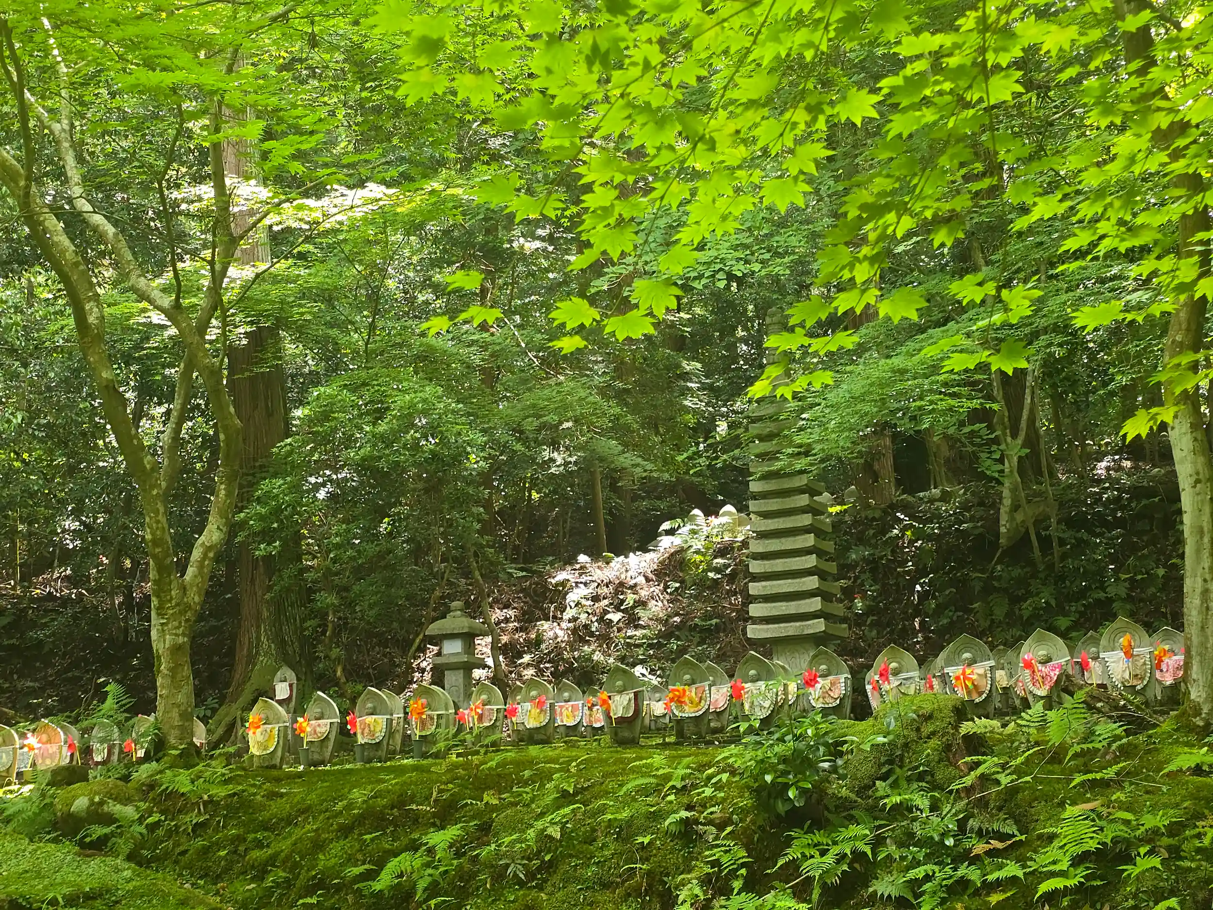 金剛輪寺様の石段の両脇には風車が設置されたお地蔵さんや石仏がズラッと並んでいます。所々にある塔頭や子坊があったと思われる平坦な場所にもビッシリと立っていて、そこでも1体1体に風車が設置されていました。あれだけの数を見ると初めは綺麗に感じていたものが、途中からは とても寂しく物悲しいものに見えてきてしまいました。