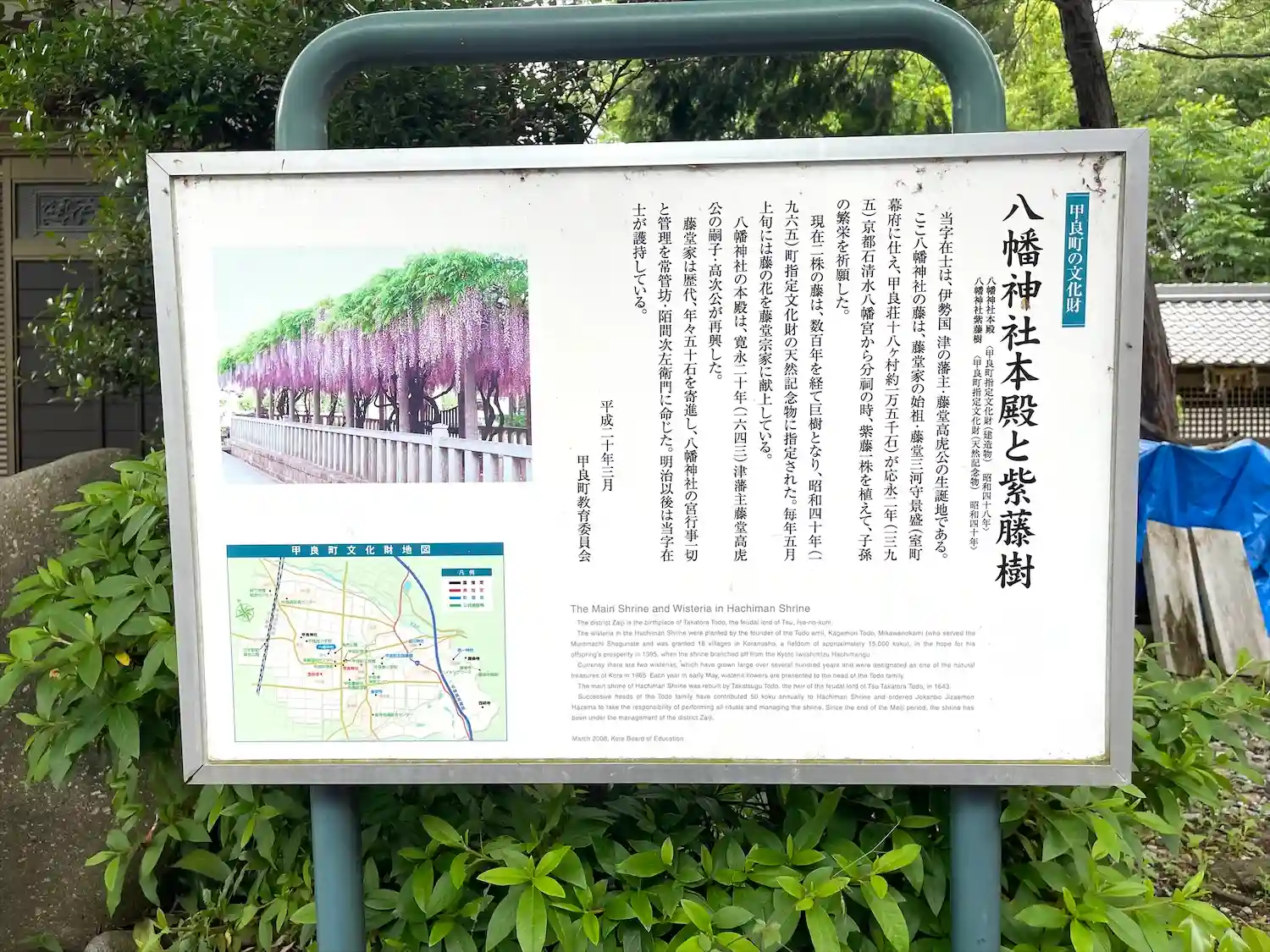 高虎の先祖の藤堂影盛が石清水八幡宮を勧請して建立したのが始まりといわれています。本殿は藤堂氏が大名になる時に修復されたと伝えられています。鳥居脇と本殿裏にある紫藤は、影盛が子孫繁栄を祈願して植えたと伝えられ毎年5月に藤切祭が行なわれ、東京の藤堂家に贈ることが習わしになっているそうです。