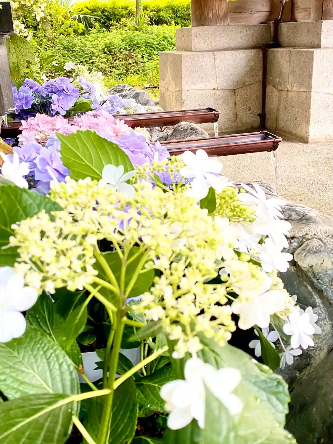 手水舎を紫陽花で彩っていただきました。