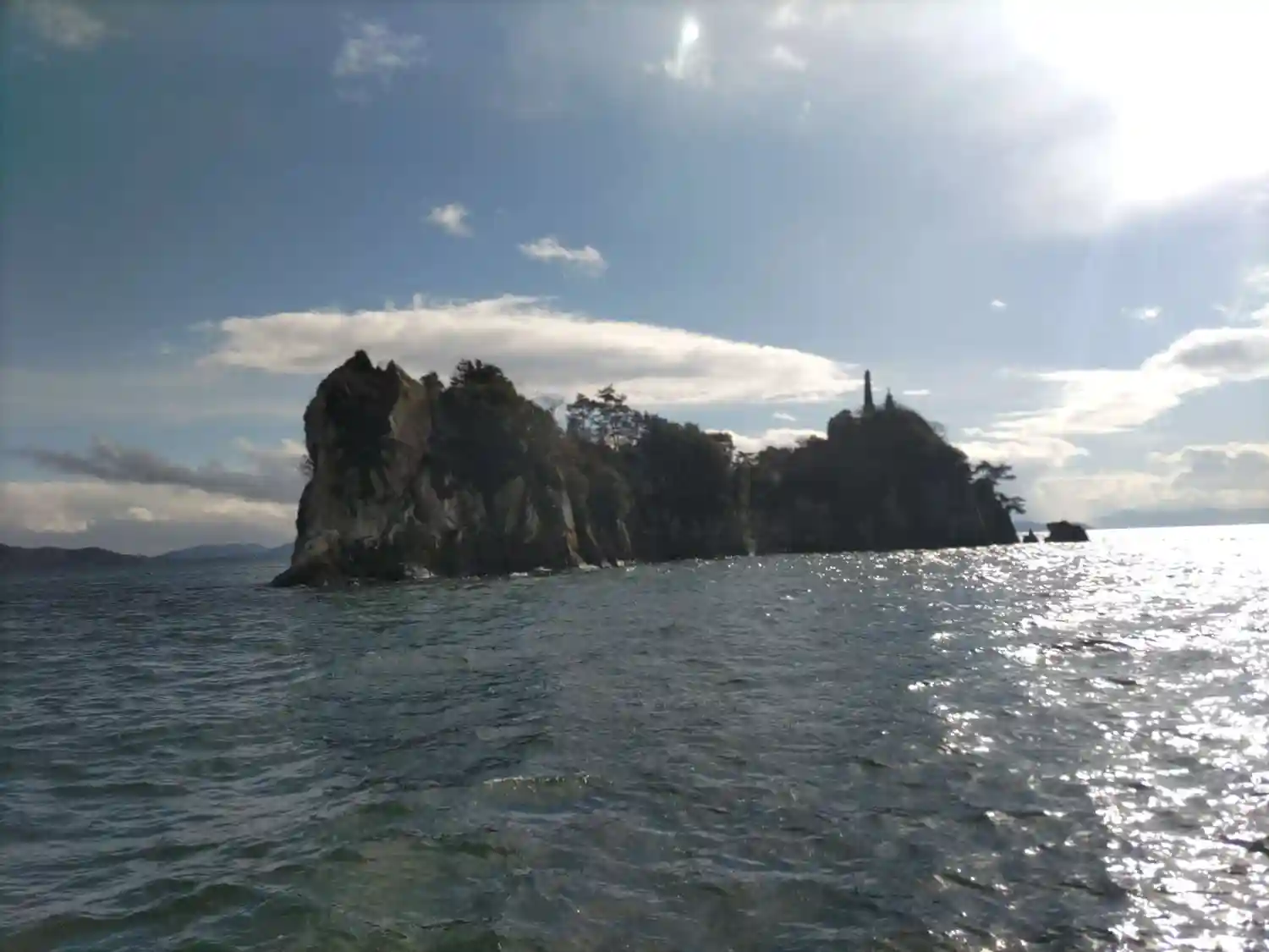 帰りの船から題目岩付近を。島の周りには何隻ものボートが釣り糸を垂らしてました🐟️