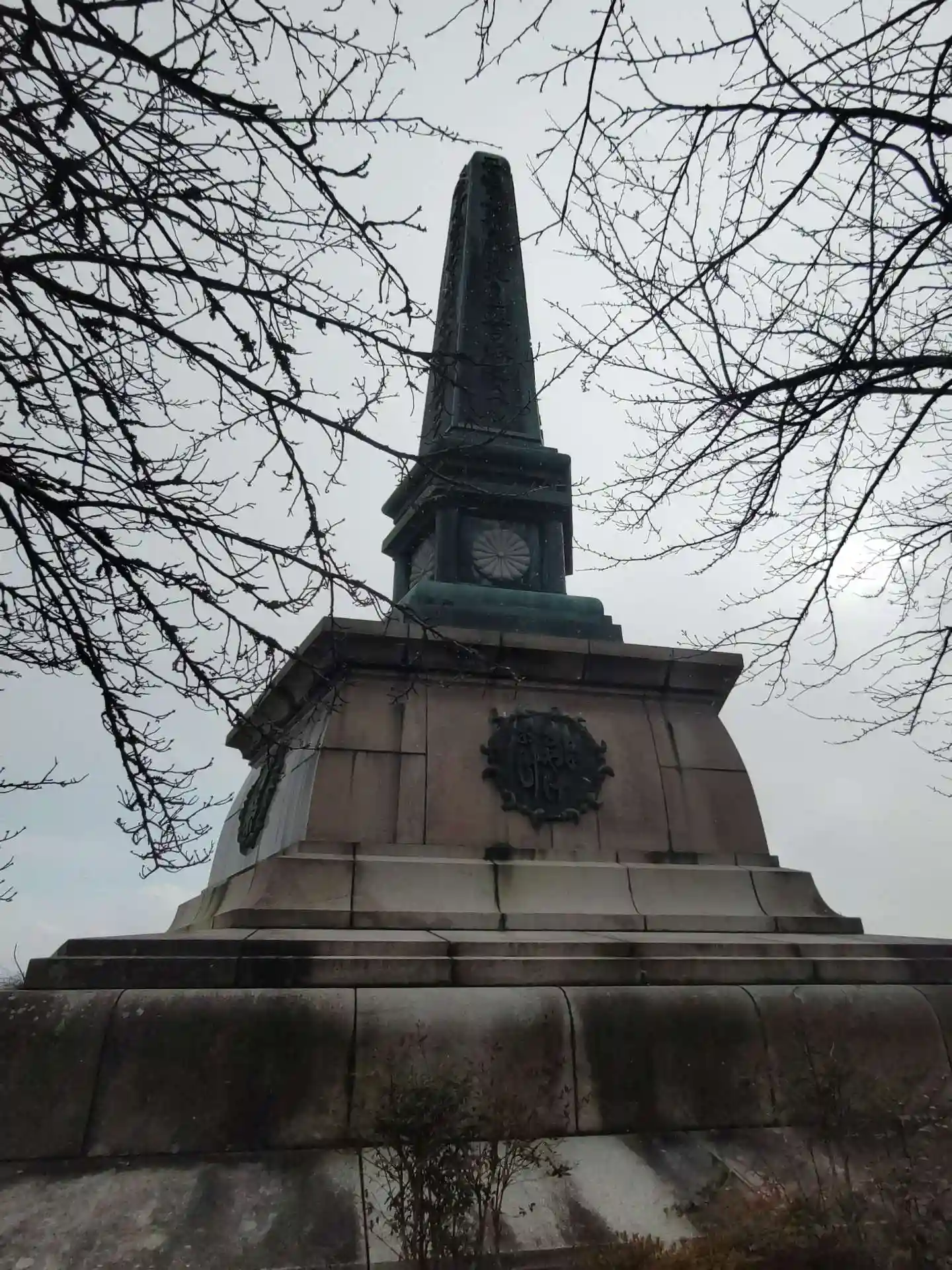 誓いの御柱。五角形の柱の五面それぞれに五箇条の御誓文が刻まれています。