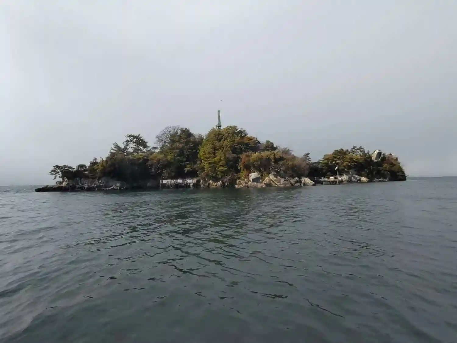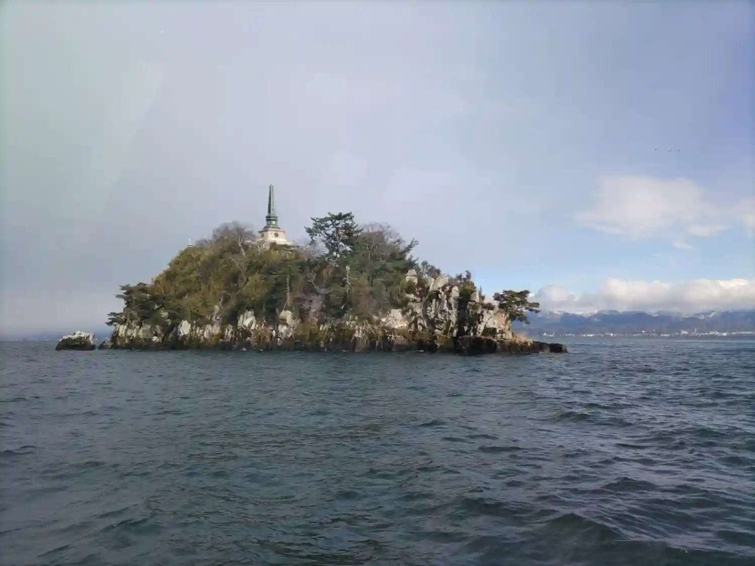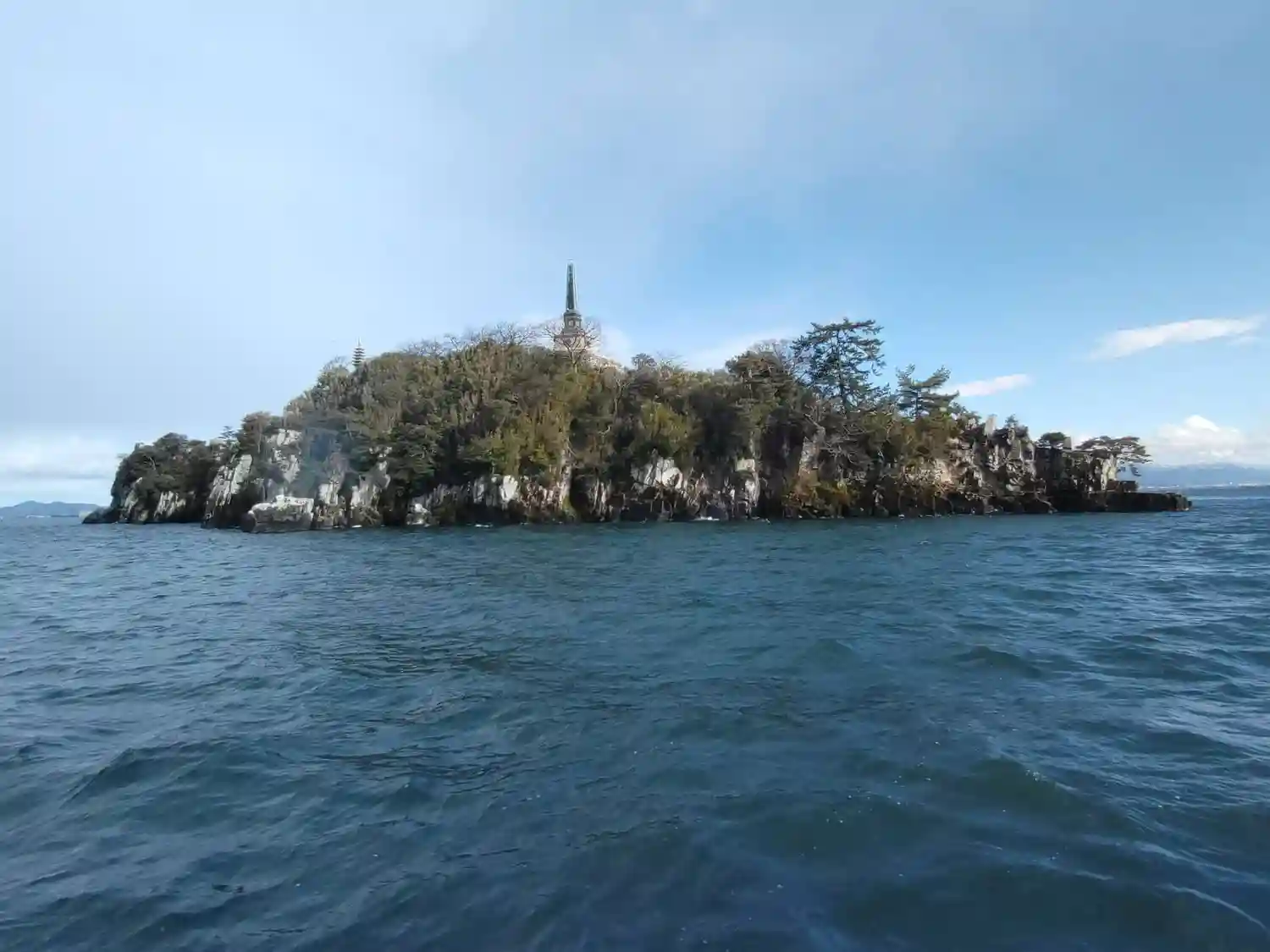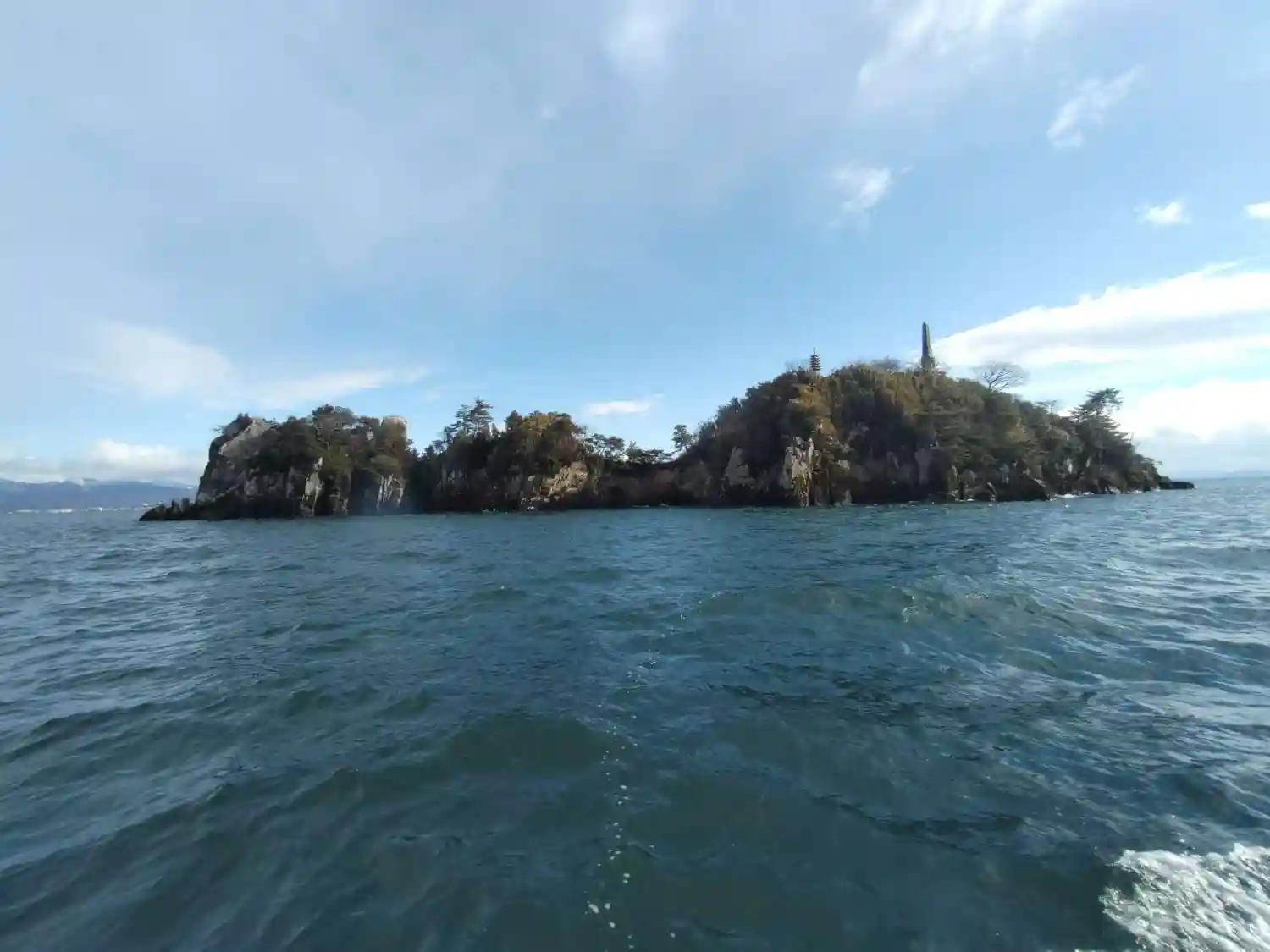 帰りの船から題目岩付近を。島の周りには何隻ものボートが釣り糸を垂らしてました🐟️