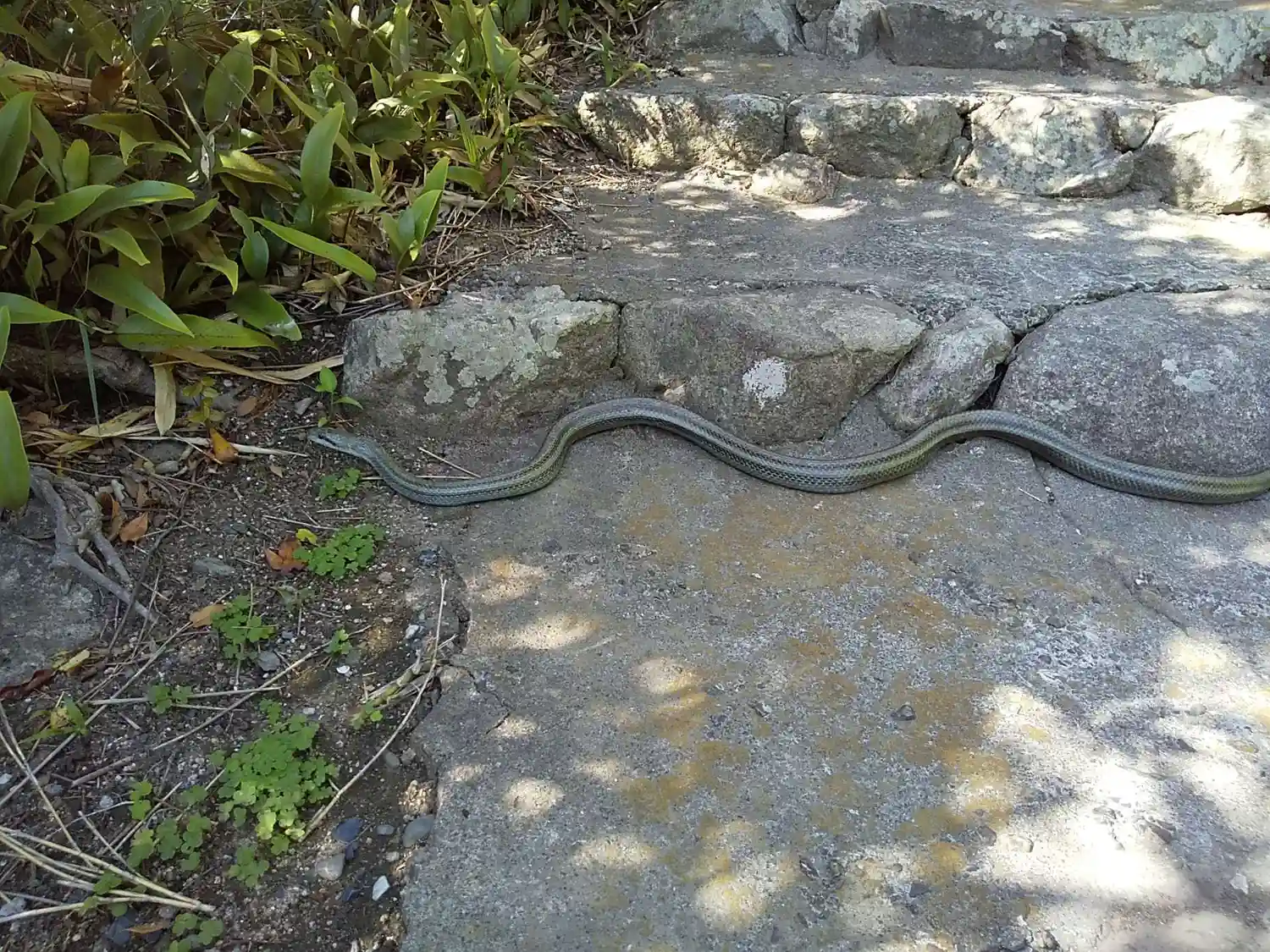 誓いの御柱近くの階段でお蛇様のお通り🐍こんな湖の真ん中の小さな島でも生息できるんですね。