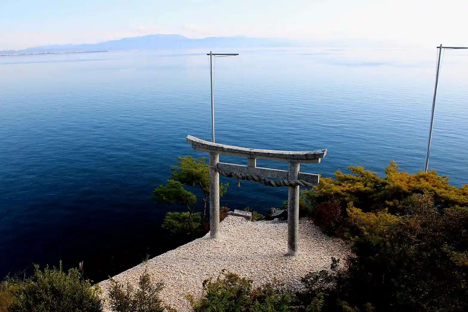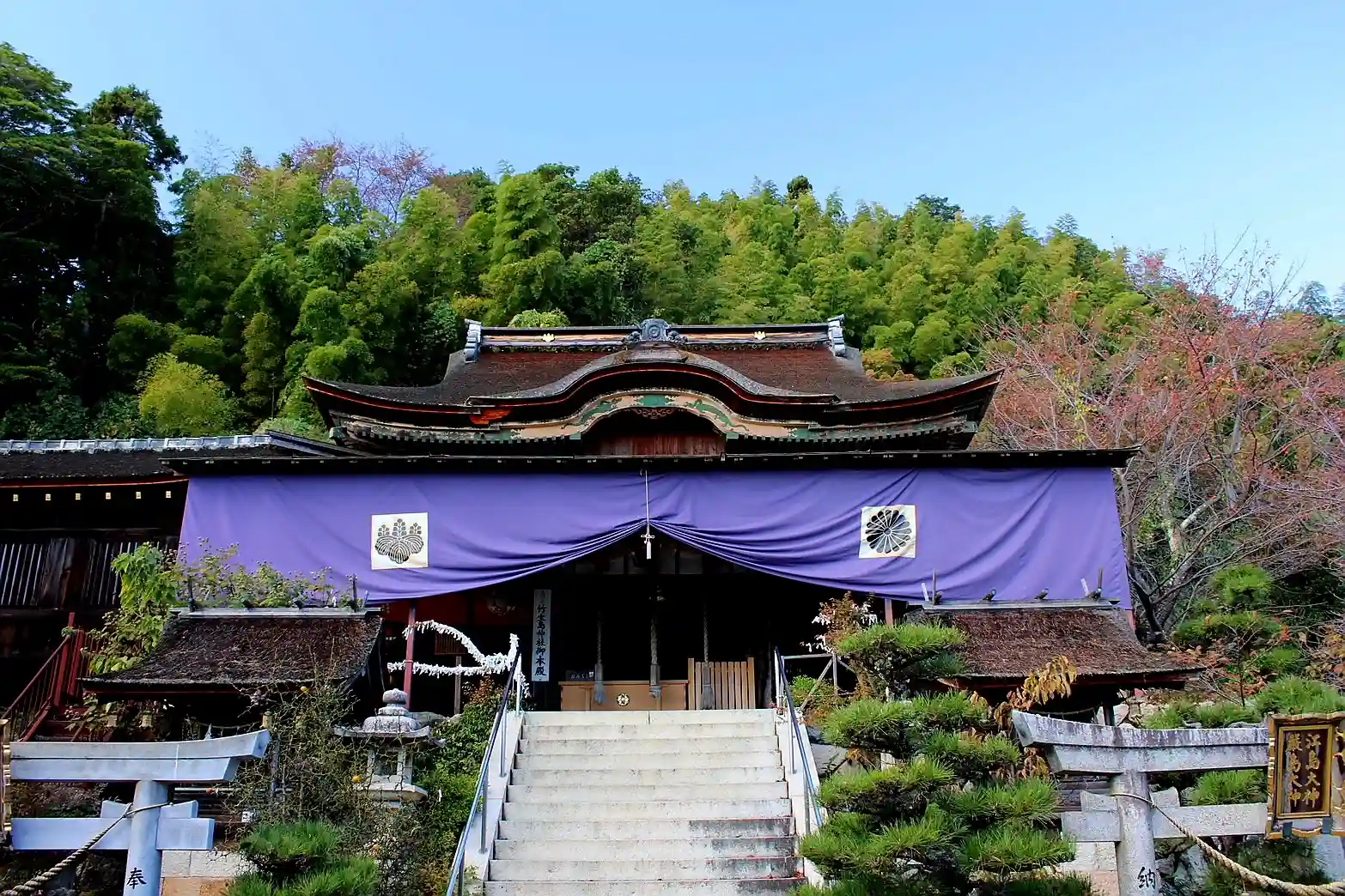 そこから舟廊下で繋がる都久夫須麻神社の優美な本殿へ。かわらけ投げという願掛けが有名です。
