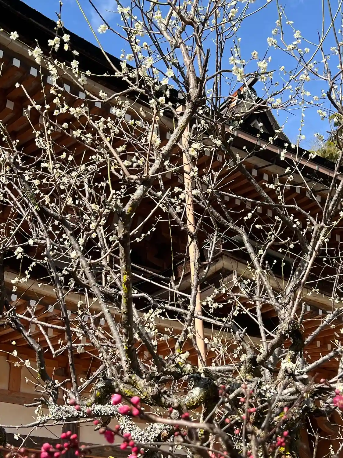 急な階段を登りお参りをする。梅の花が咲き始めており優美な雰囲気に包まれる。
