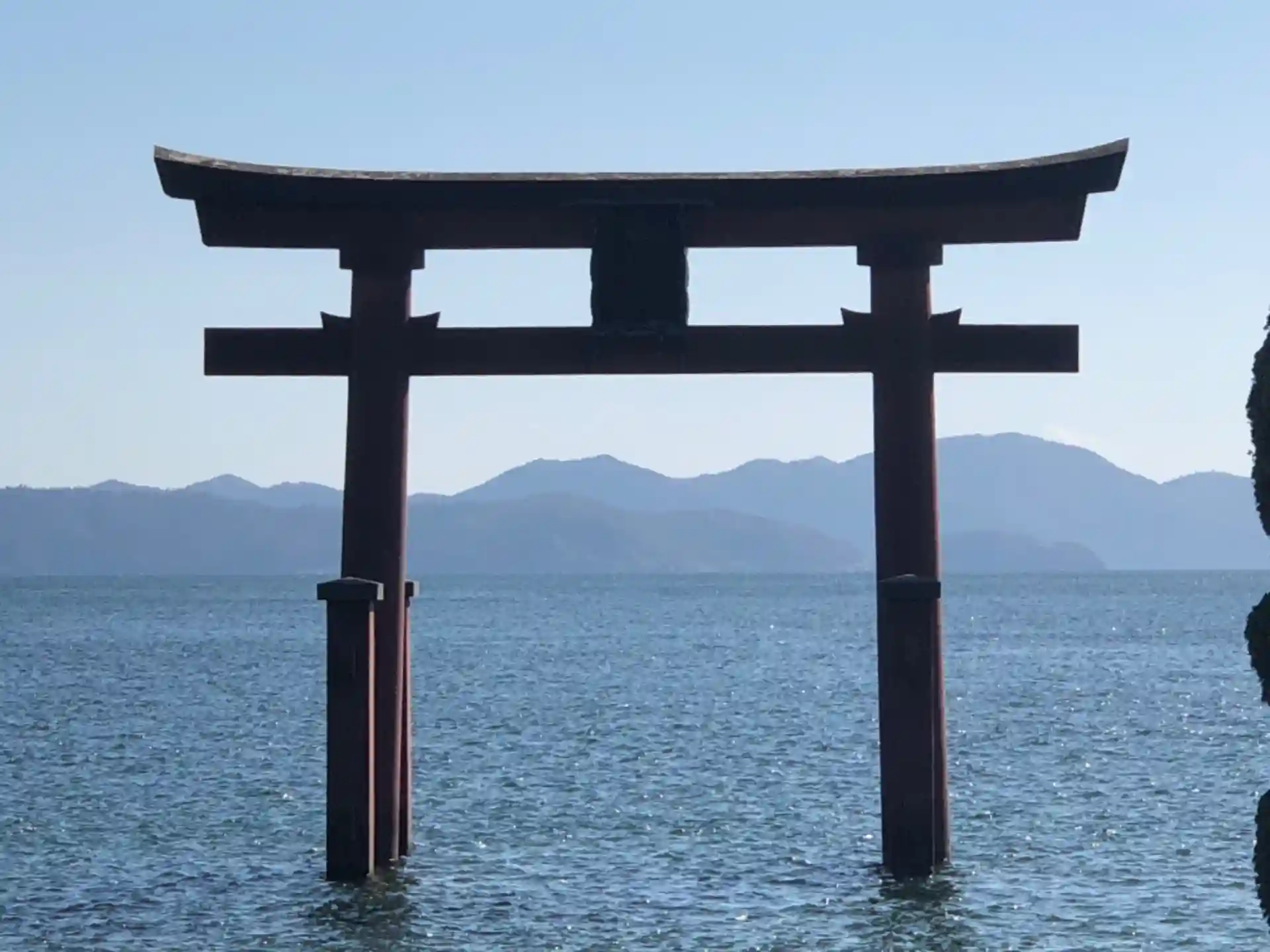 琵琶湖にたたずむ鳥居。神社の前の国道を横断する人が後を絶たない。非常に危険です。鳥居の近くで写真撮りたい、見たいというのはわかるけど。
