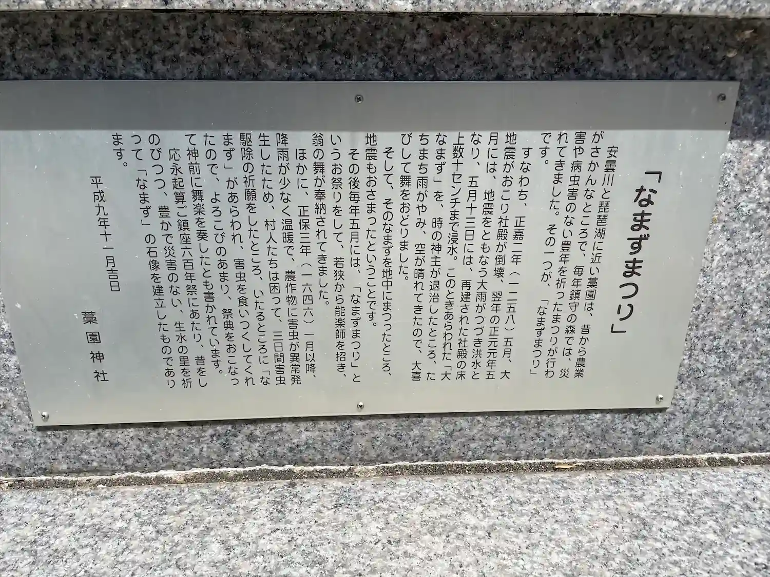 むかし ナマズをお祀りして、地震が起こらなくなったという事で、ご神体ではないのですが、ナマズをお…