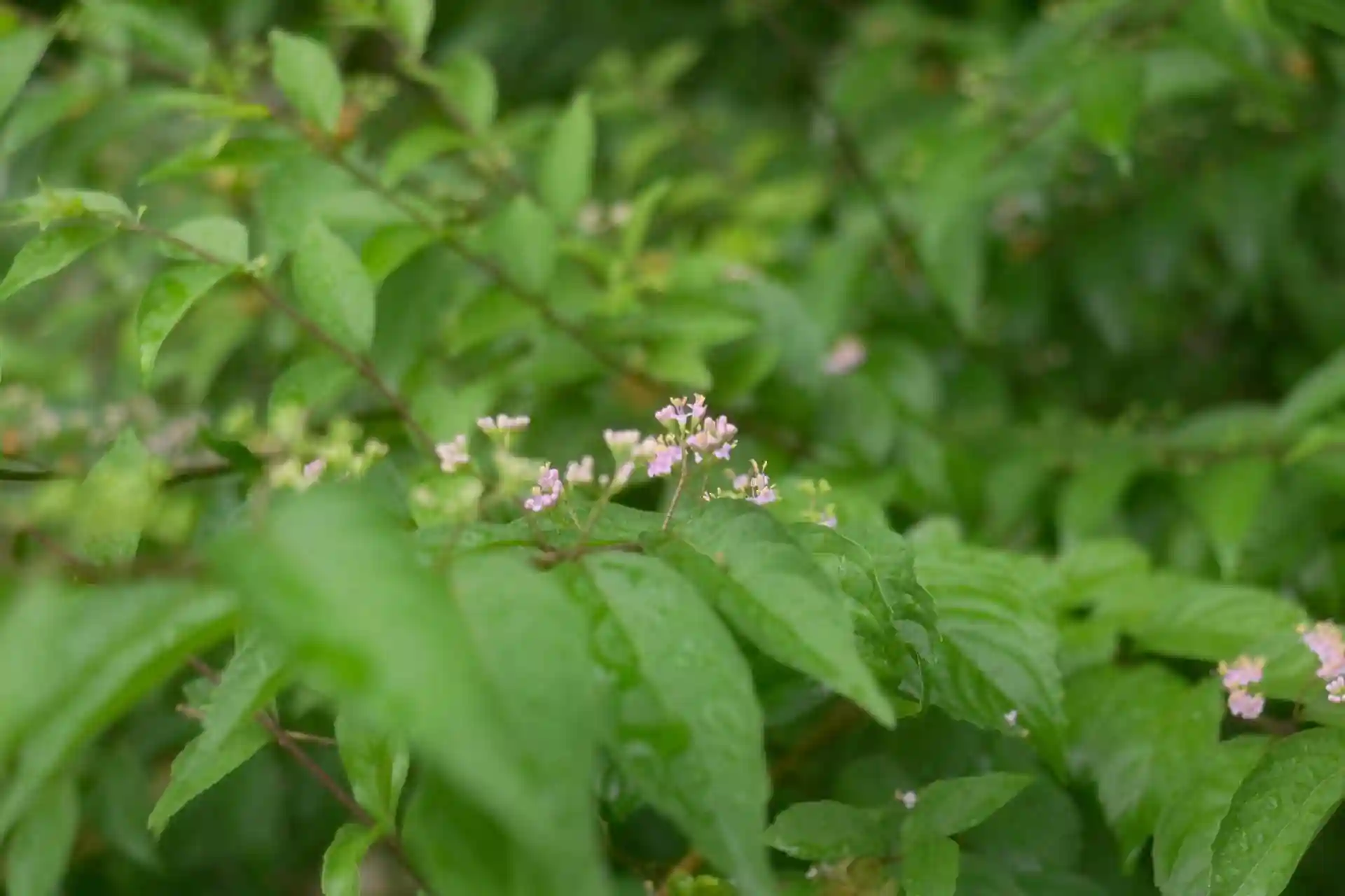 梅雨時の境内に、ムラサキシキブが可愛く咲いています。