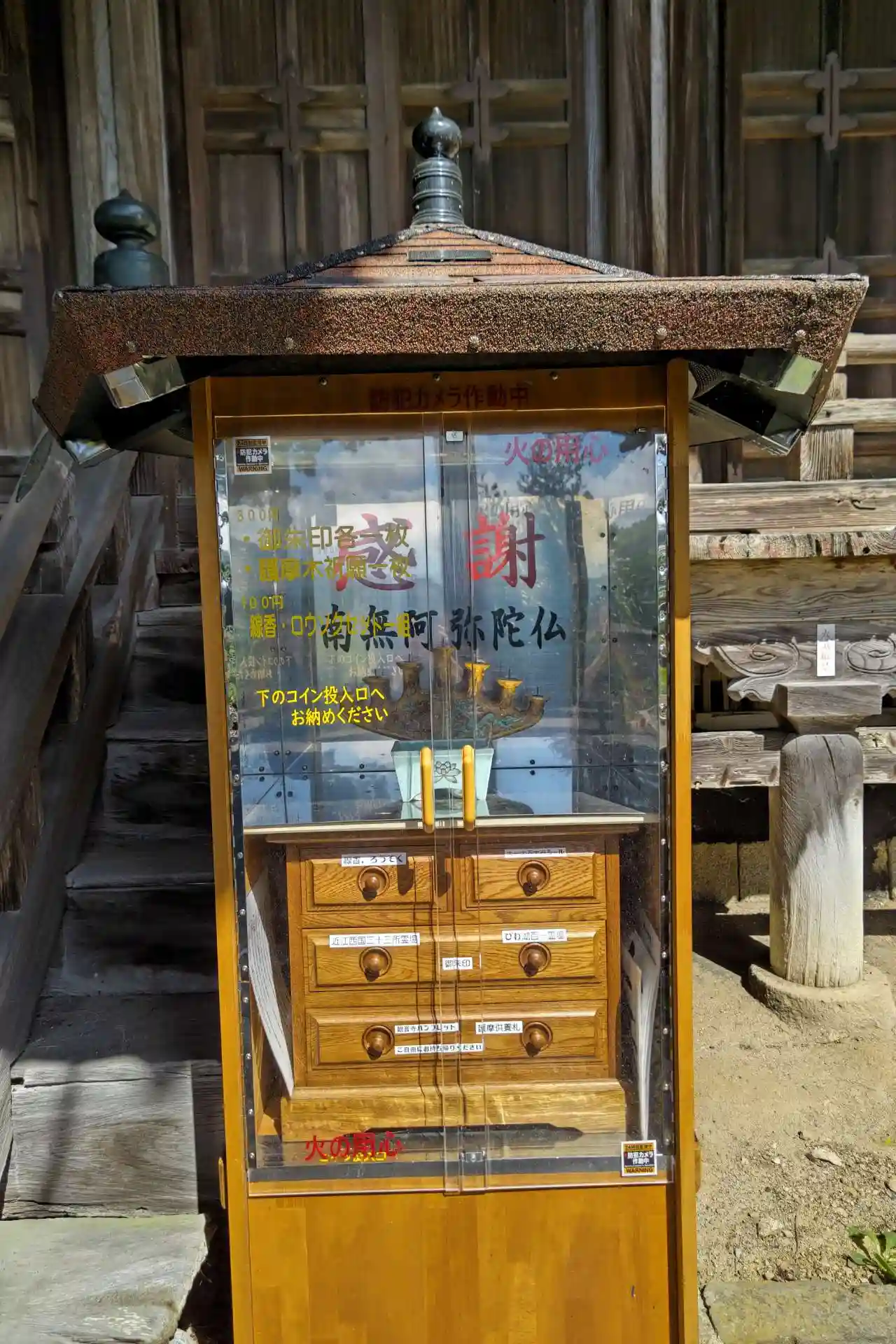 御朱印は本堂前に書き置きが準備されています。透明の扉をあけると、自動でガイドが流れます。