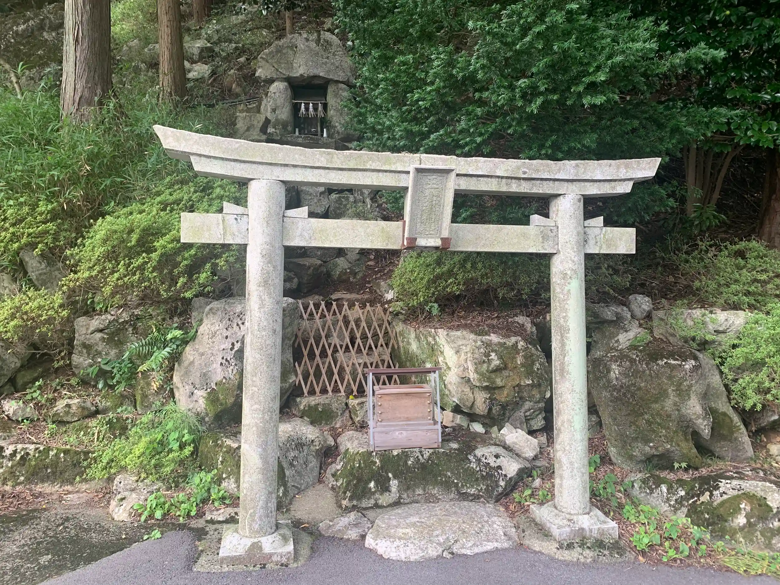 背の低い石鳥居の下に賽銭箱。