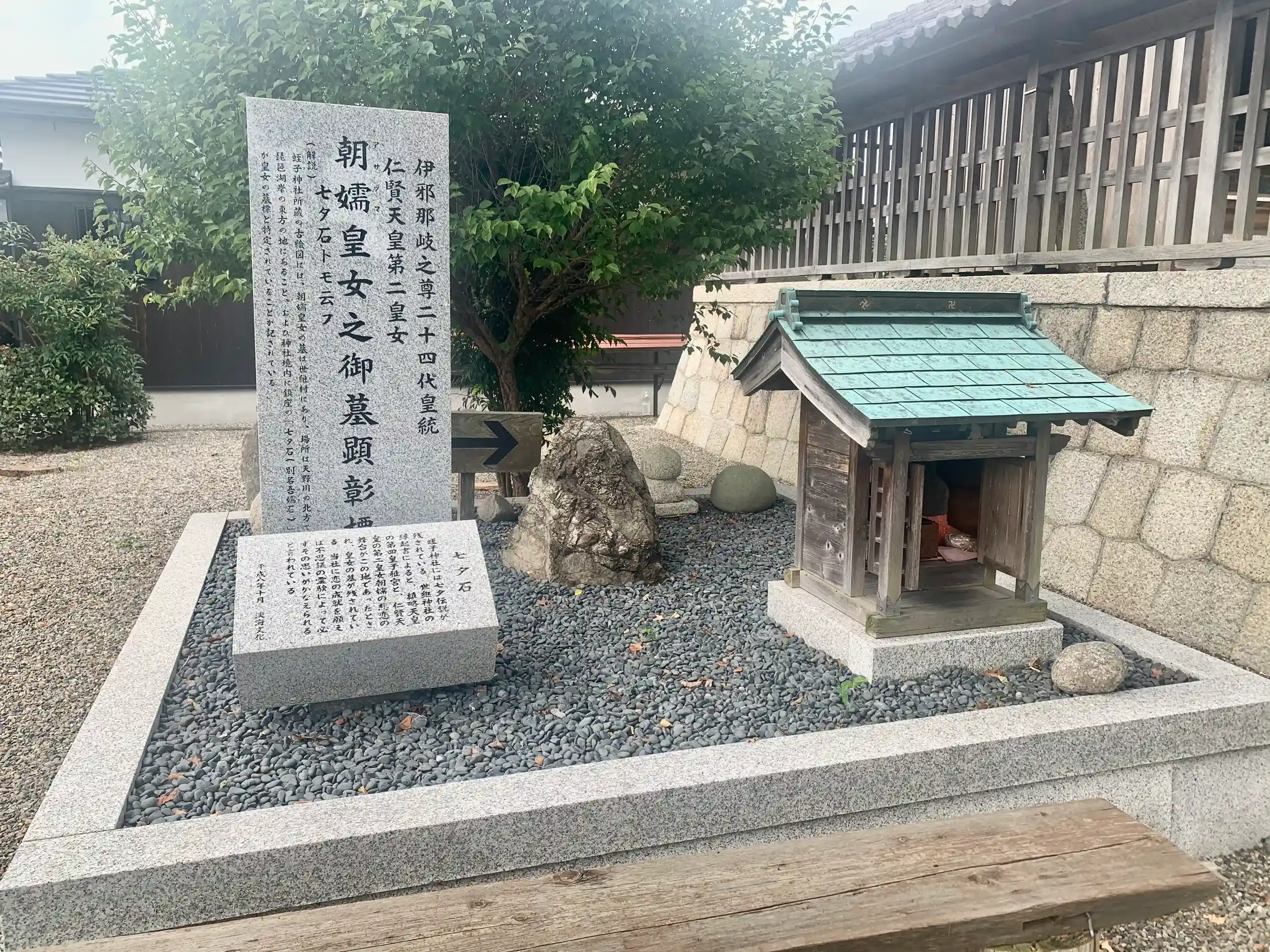 拝殿左側奥に「朝嬬皇女御墓顕彰碑」と「七夕石」