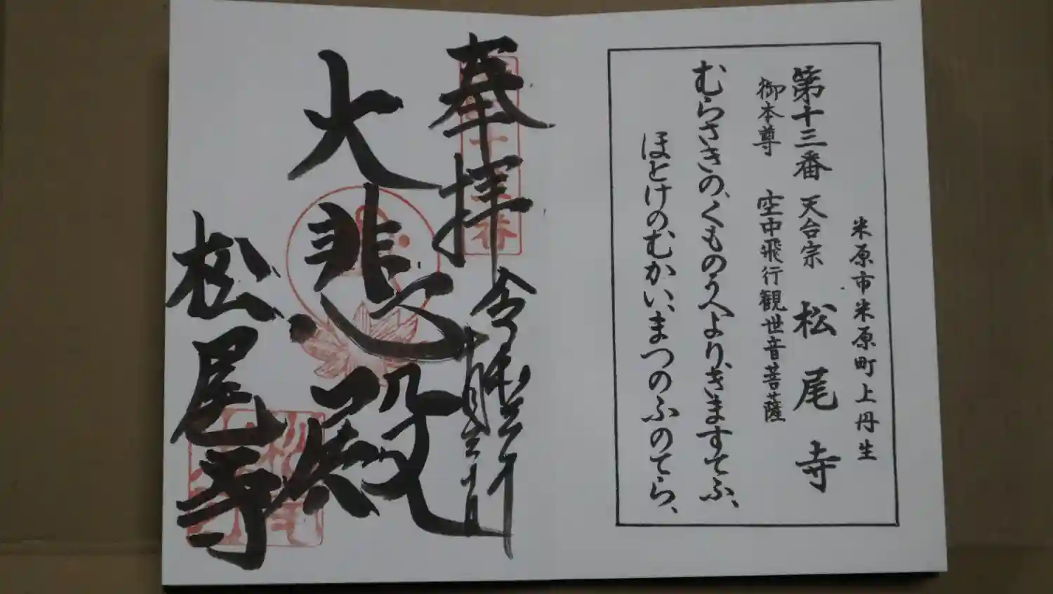 近江西国三十三所13番の御朱印。びわ湖108霊場の御朱印には「飛行観音」と描かれてまさた。