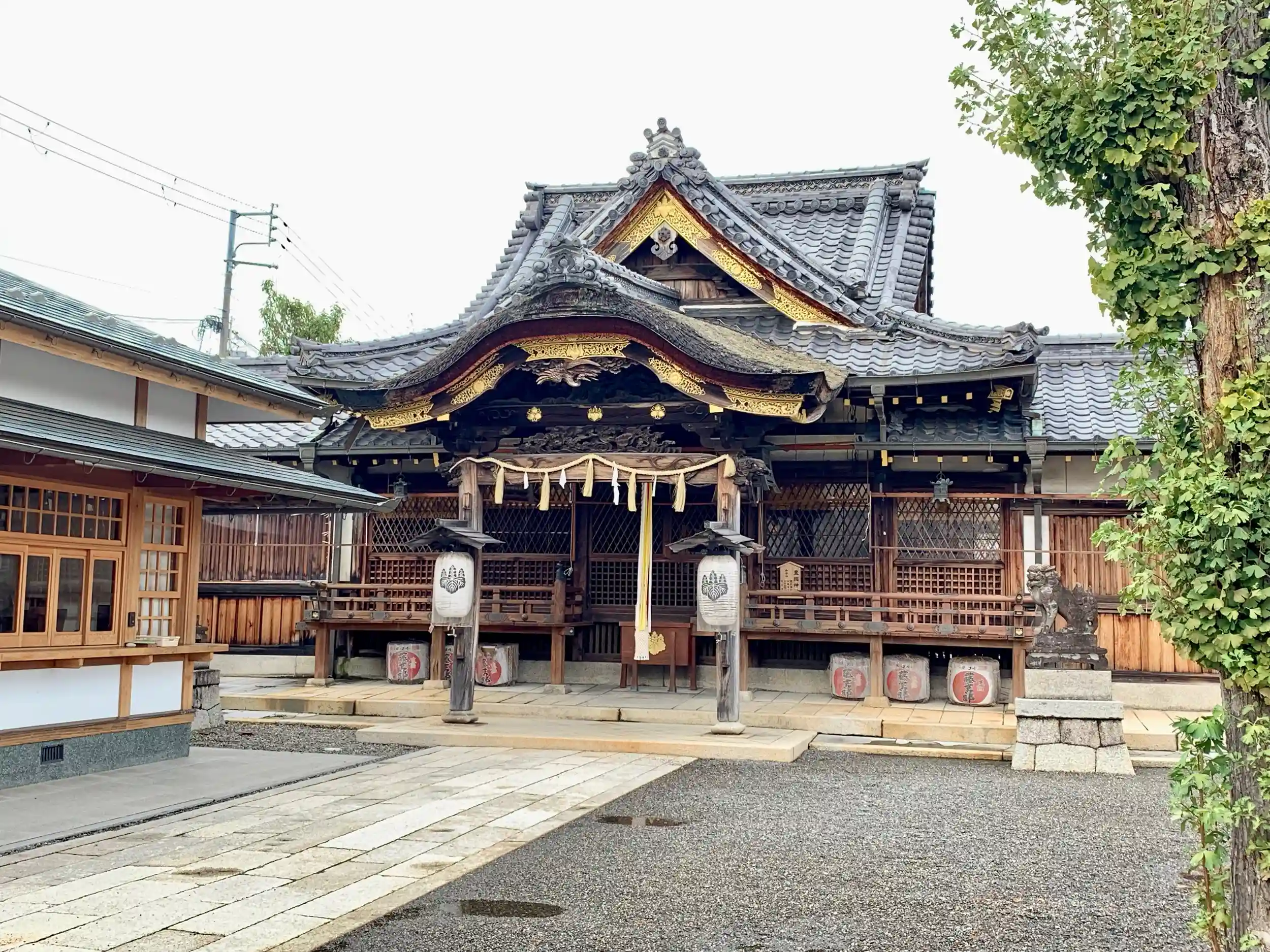 鳥居をくぐり、正面が豊国神社の拝殿、左手が社務所。
