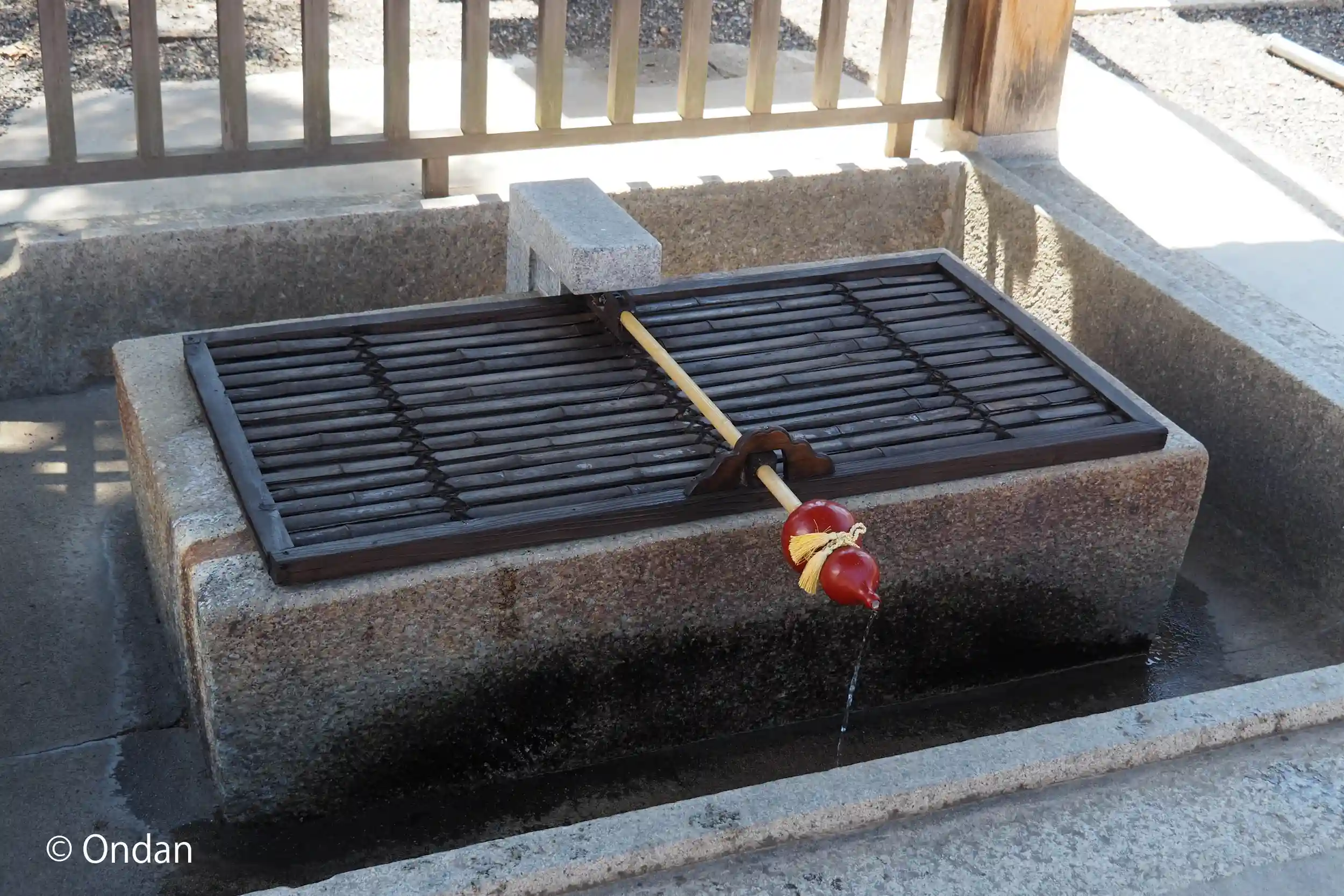 手水舎。ヒョウタンの先から水が出ます。低くてちょっとやりにくい。