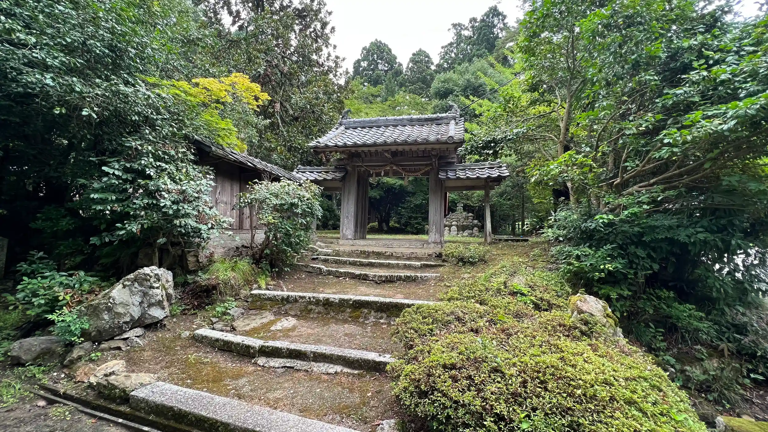 緩い階段で山門。山門入ってすぐに無縁仏が積まれてる。