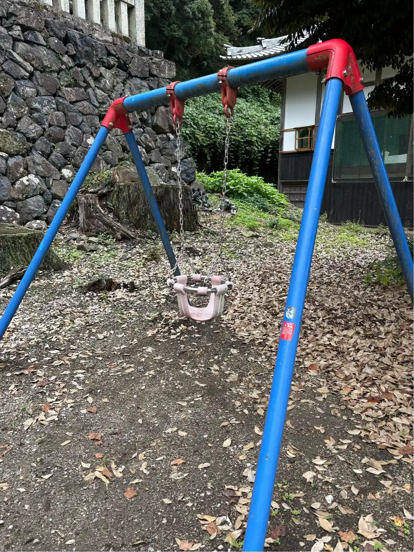 駐車場な隅にぽつりと残された子供用のブランコ。このタイプはなかなか見かけませんね。