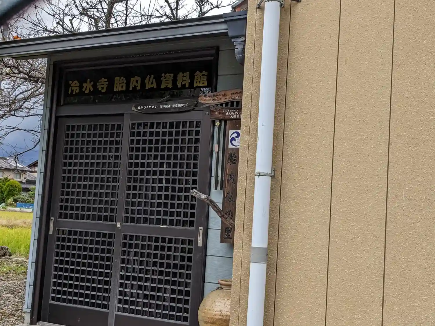 寺号柱の右側に在る冷水寺胎内仏資料館