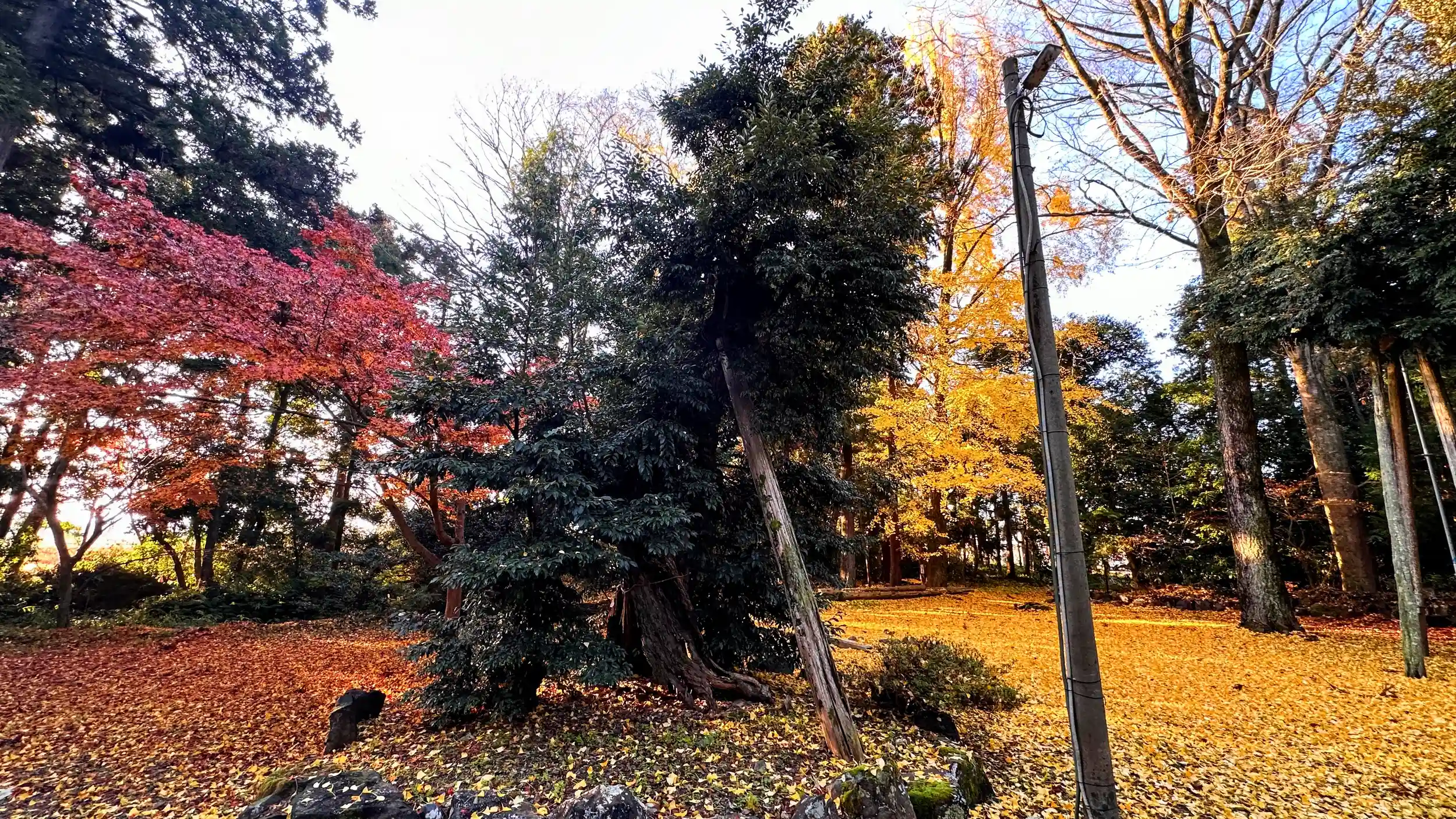 鳥居を抜けると御神木が正面に見えます 御神木を境にして イチョウとモミジの落ち葉の絨毯が綺麗に分かれます 御祭神、大山祇命 少彦名命 泉龍大神 第49代光仁天皇の御宇、真人三船が勧請した所と伝えられています、馬頭観音立像 平安時代末期の作であり、神仏習合の名残で神社に安置されています。(観音の里歴史民俗資料館に寄託され、観音の里ふるさとまつりの時のみ同社にて公開されています。)