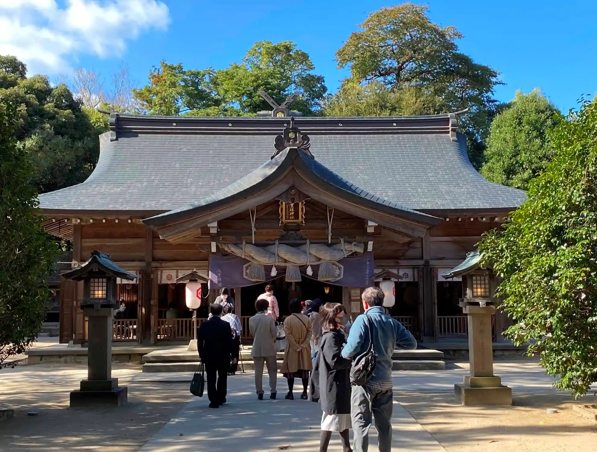 拝殿は1964年の再建。大きな注連縄が掛かっている。