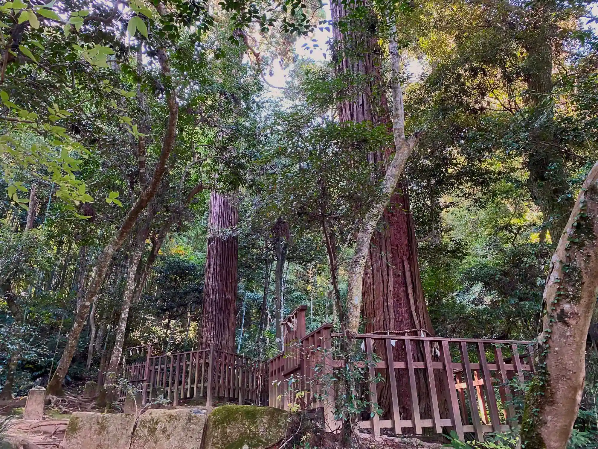 裏境内にある赤い2本の杉、<夫婦杉>。