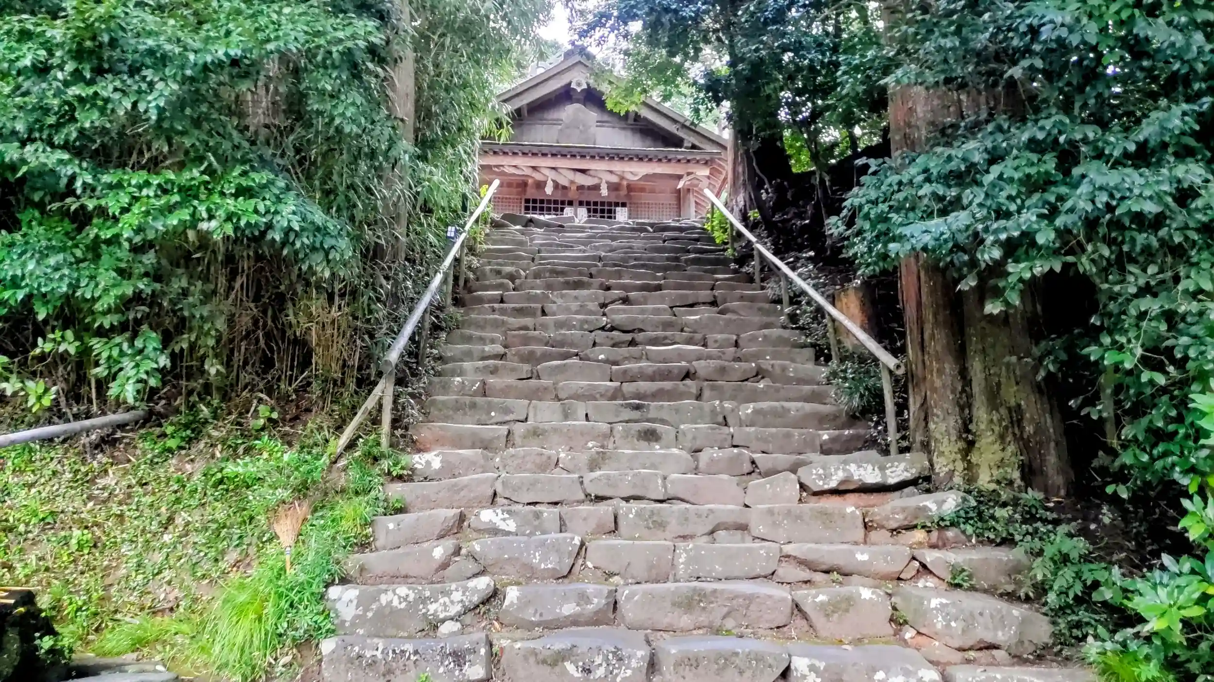 比較的なだらかな女坂から上がると本殿、拝殿を横から見る位置に出ます。