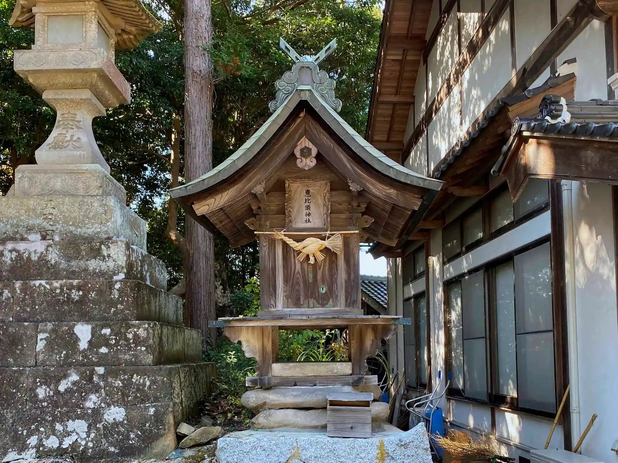 先に社務所の並びに建っている境内社群を見て廻る。まず社務所の左脇にある、小さな<恵比寿神社>。