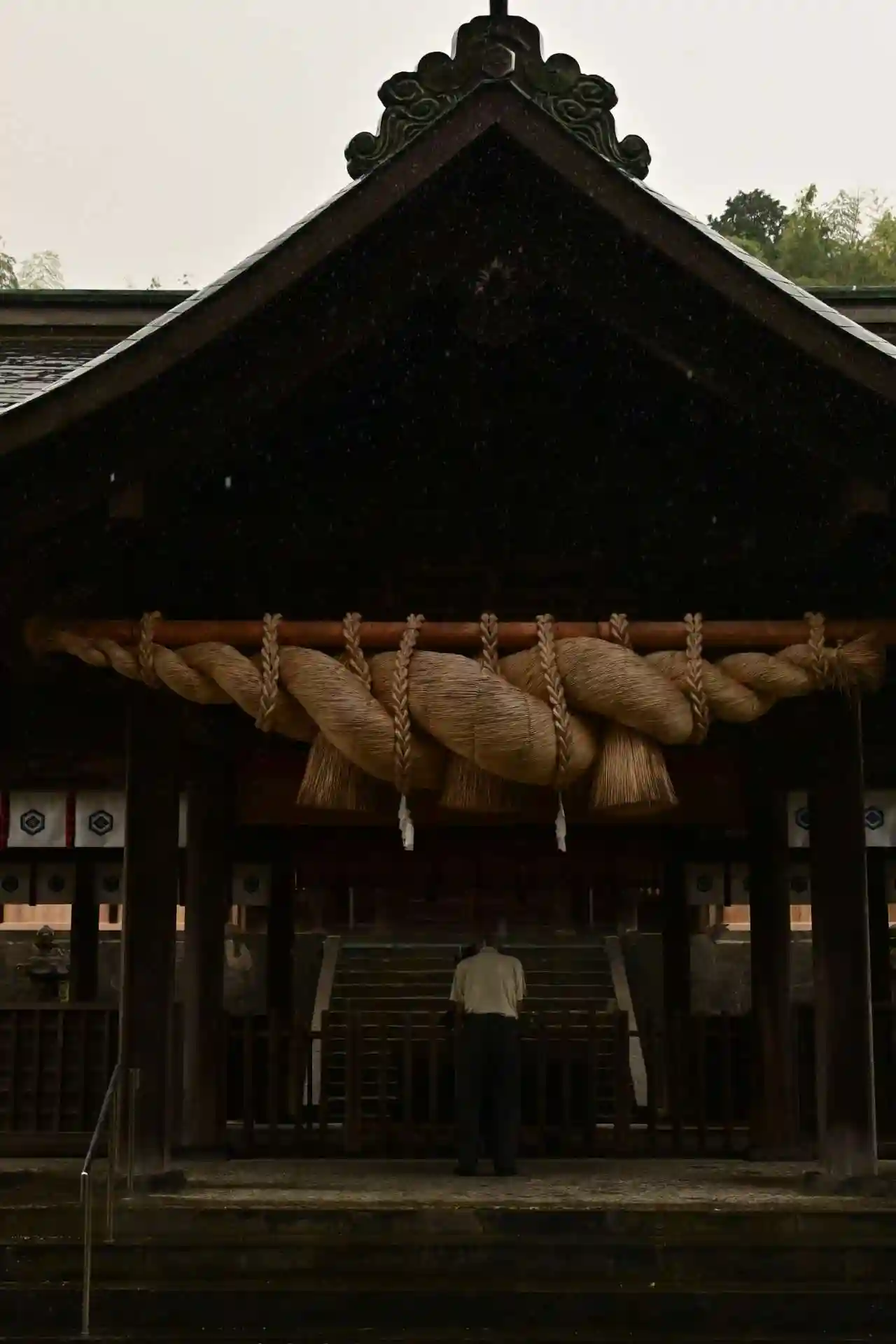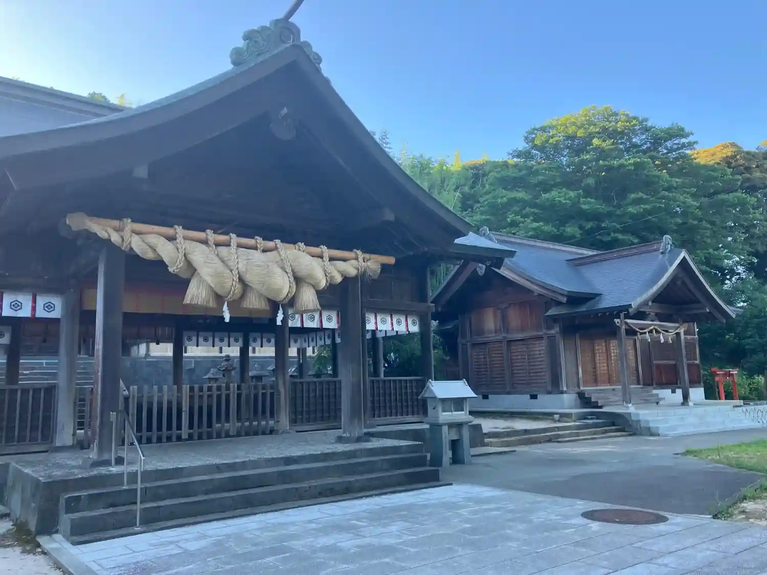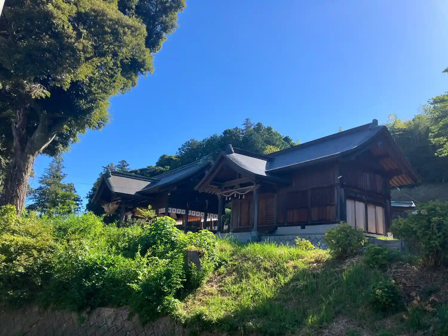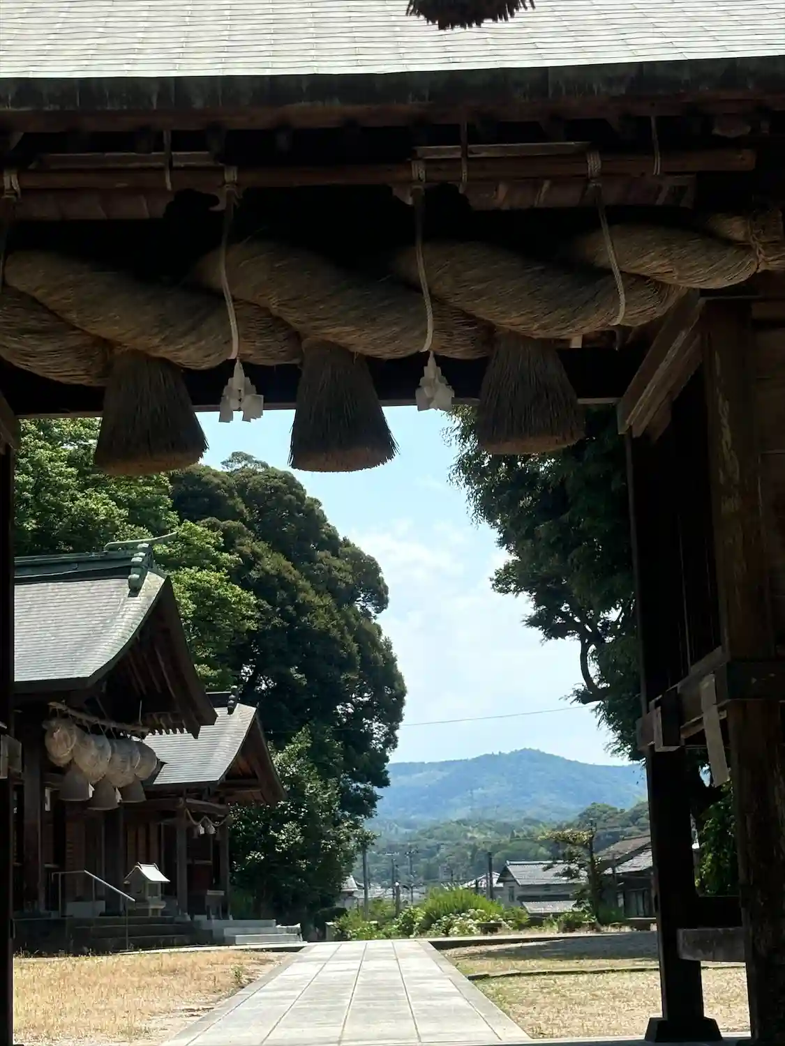 荒神社あたりから振り返ると、大きな躯体に大きな注連縄が掛かった<拝殿>。