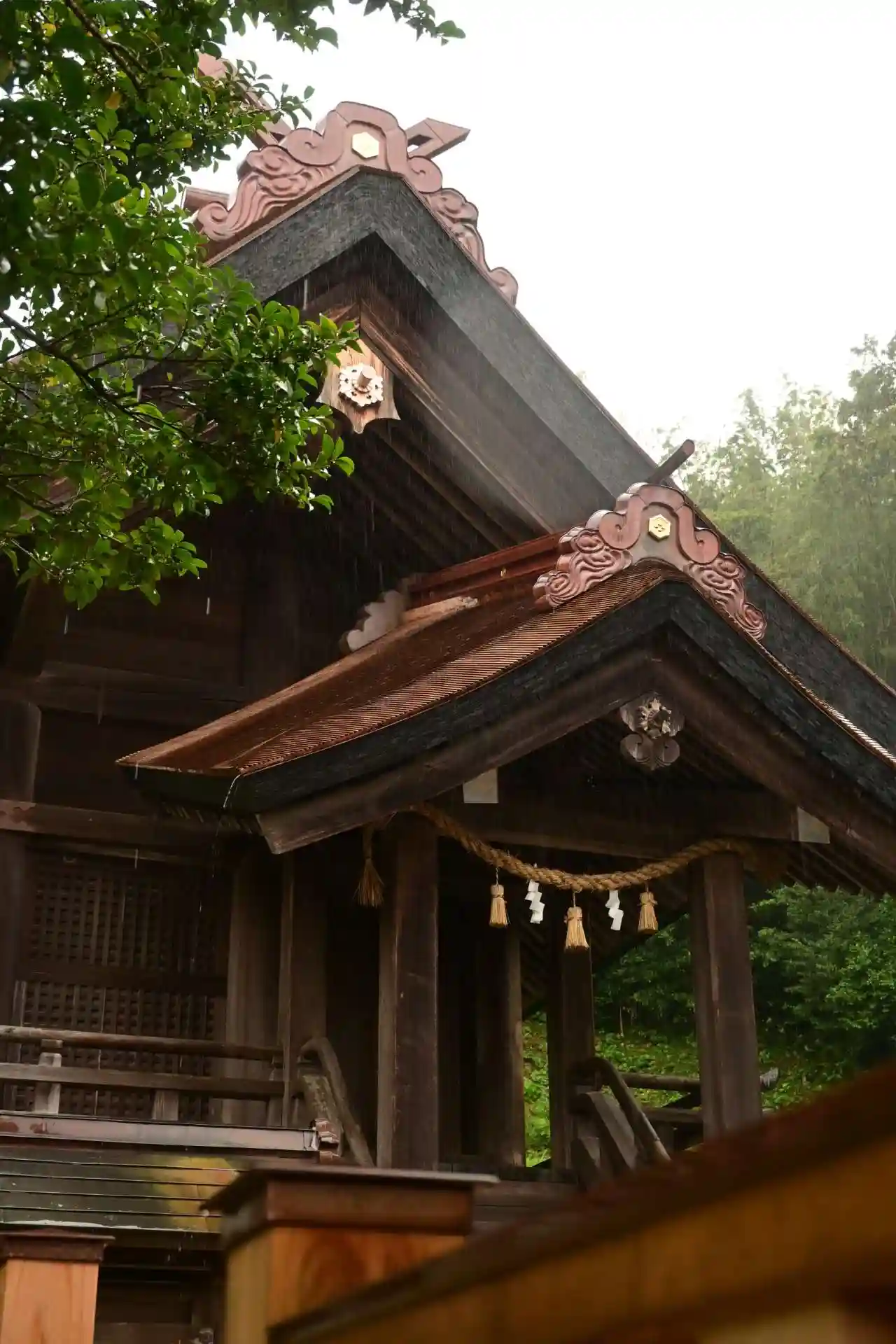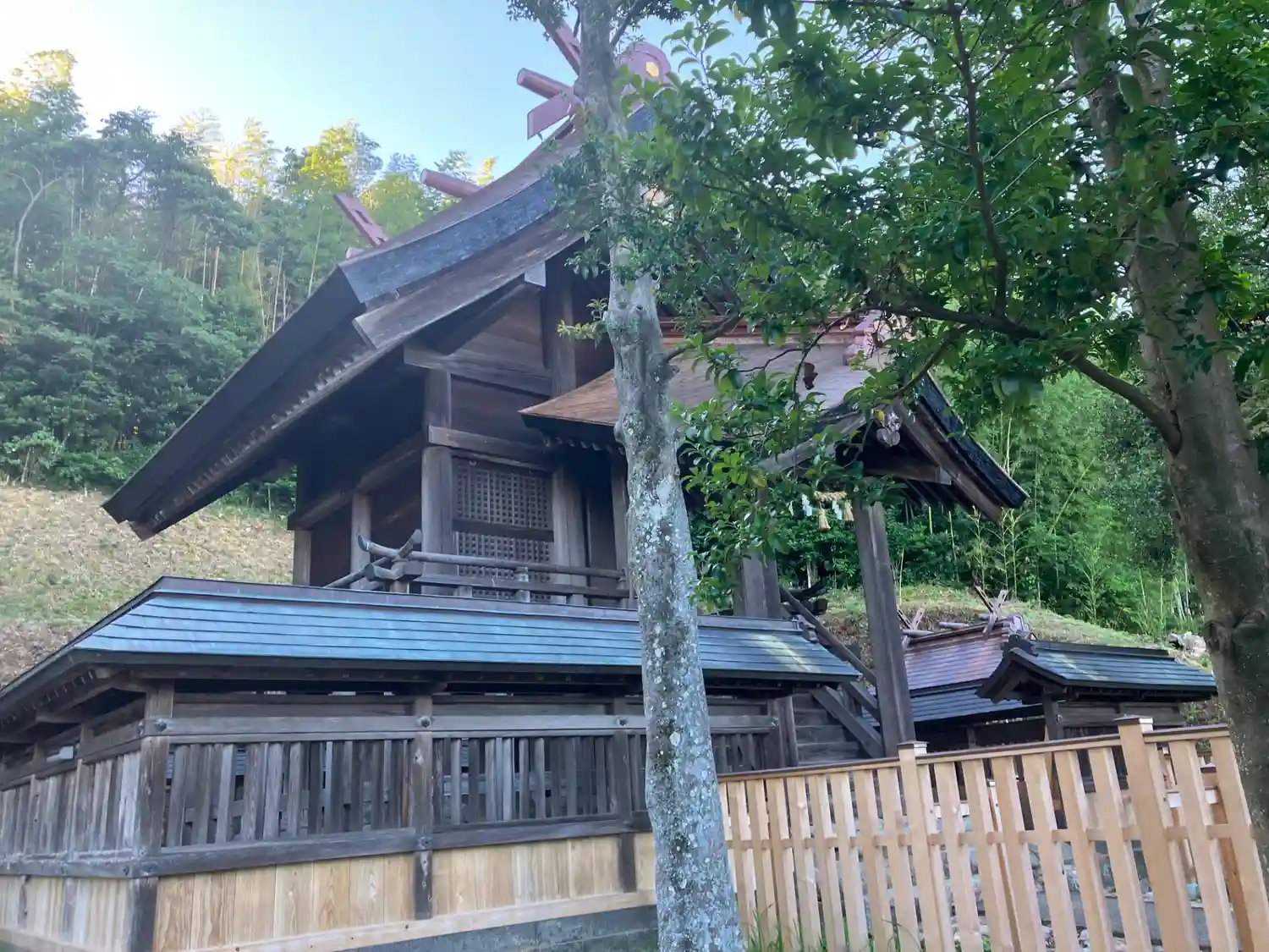三穂津姫神社の後ろあたりから、本社<本殿>を見上げる。造立時期は不詳。大社造、檜皮葺。