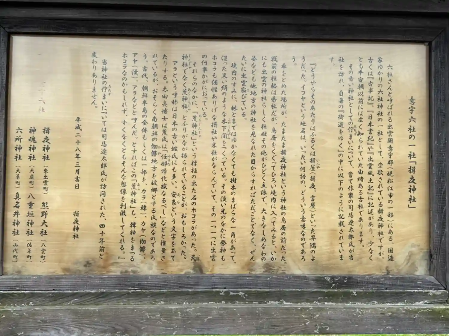 扁額を確認。こちらが『延喜式神名帳』に記載されている「出雲國 意宇郡 同社坐韓国伊太氐神社」。