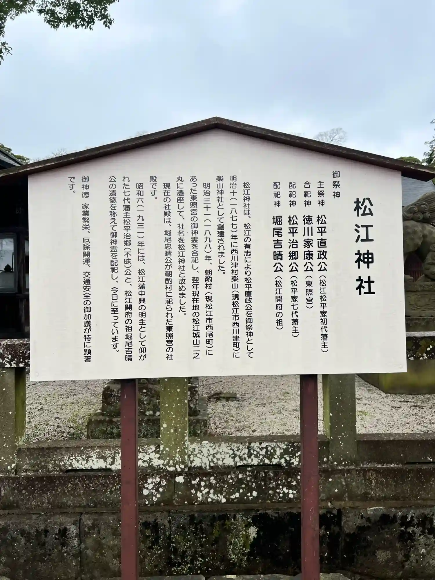 配祀神は松平治郷(松平家七代藩主)と堀尾吉晴(松江開府の祖)です。