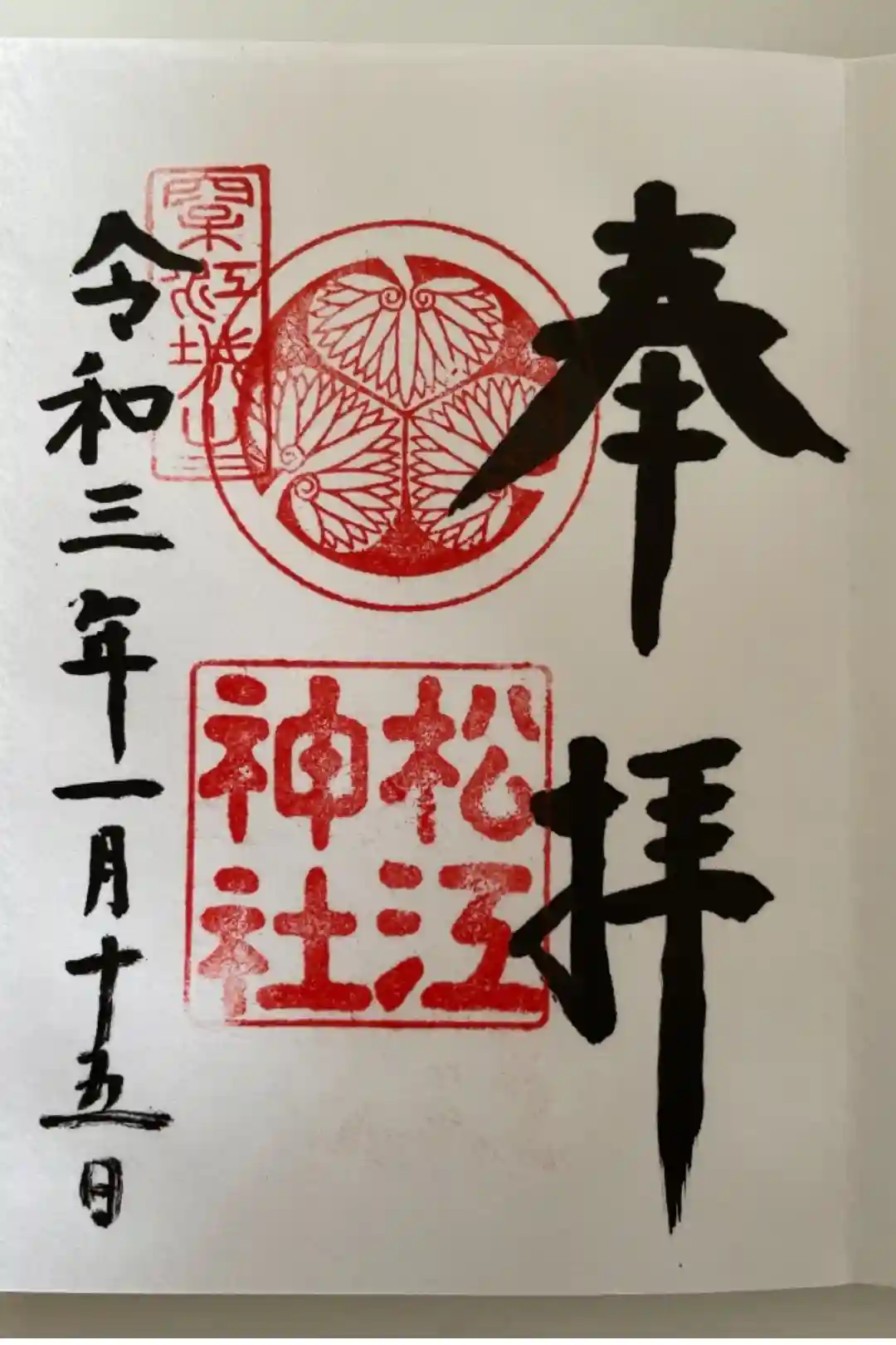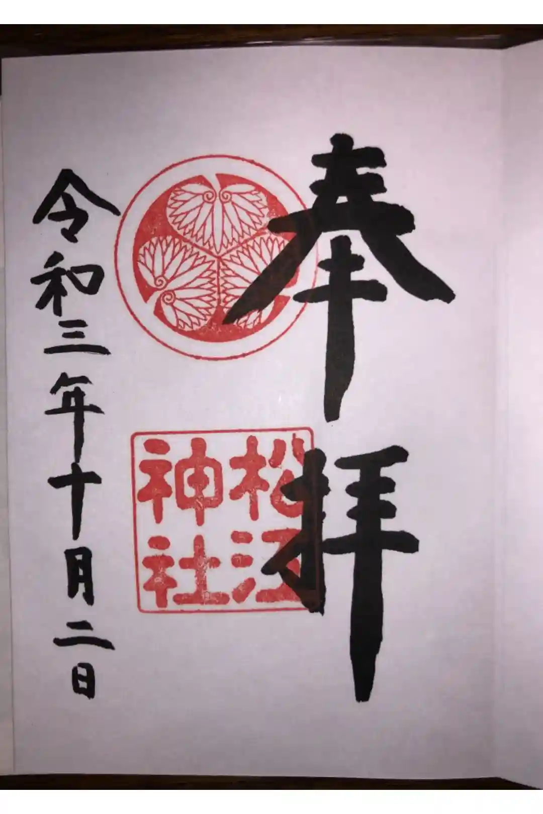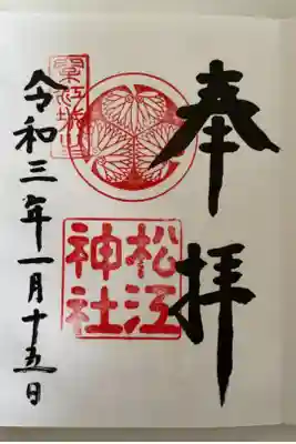 白紙の御朱印帳が1冊詰みましたので購入した時に御朱印をいただきました。松江神社の御朱印はいつのまにか3つ目です🤗
