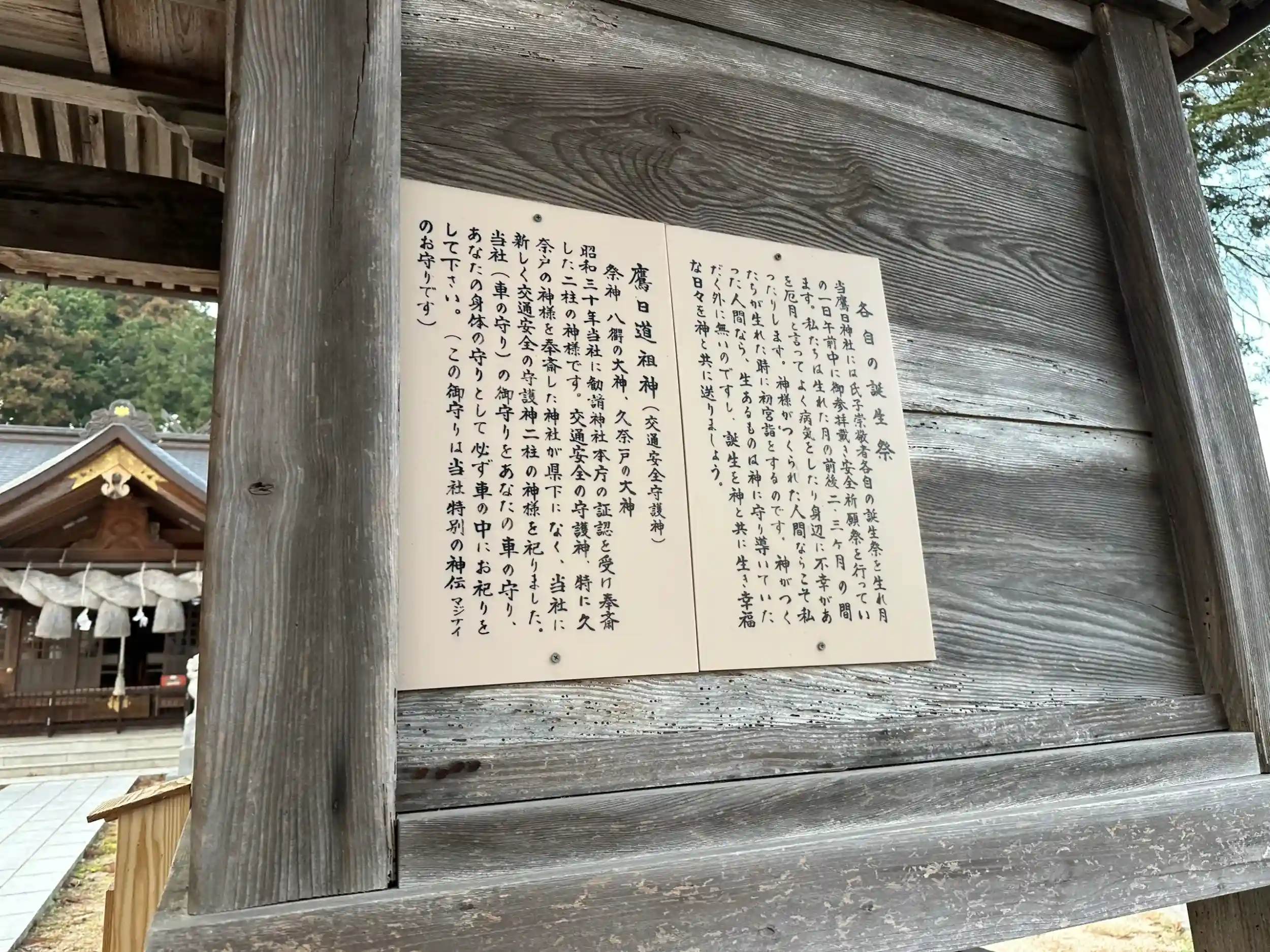 しかし主祭神は白鷹を使いとする高皇産霊神さまであるとされ、これは第14代仲哀天皇さまの御代に九州へ熊襲征伐に行っているときに高皇産霊神さまが鷹の姿になって現れたという伝承があるので、こちらが由来となって伝わったものと思われます。