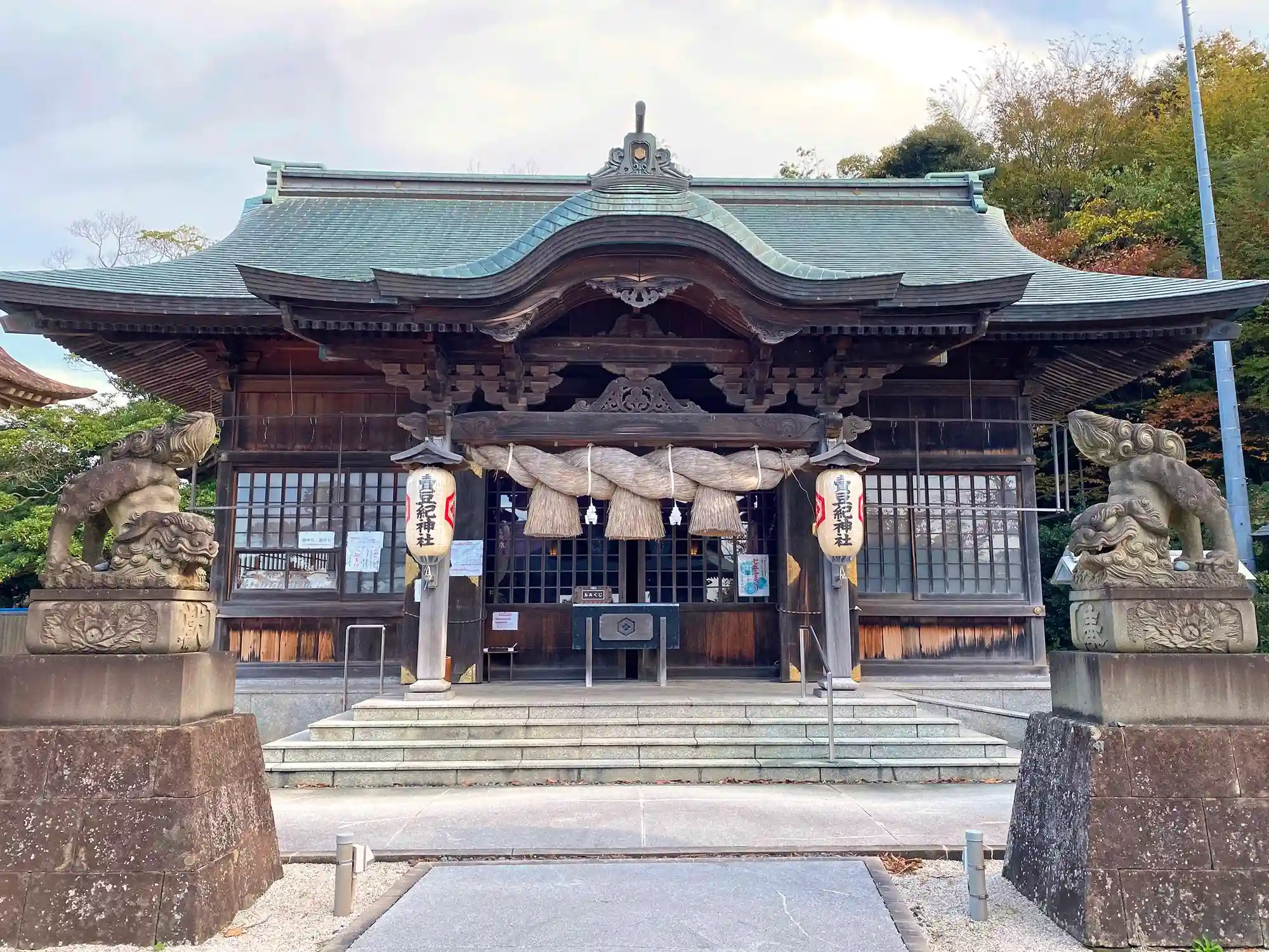 <拝殿>全景。ライトブルーグリーンの屋根やダークブラウンの躯体はシックだが、意外と新しそう。