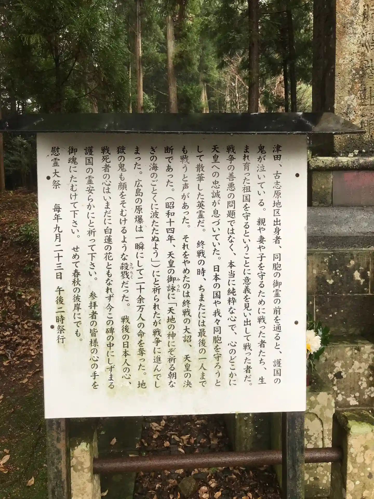 慰霊碑の説明書きです。英霊への感謝を忘れずにいたいと思います。