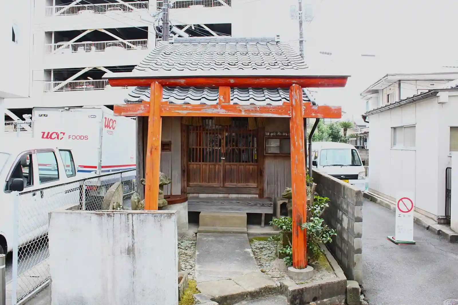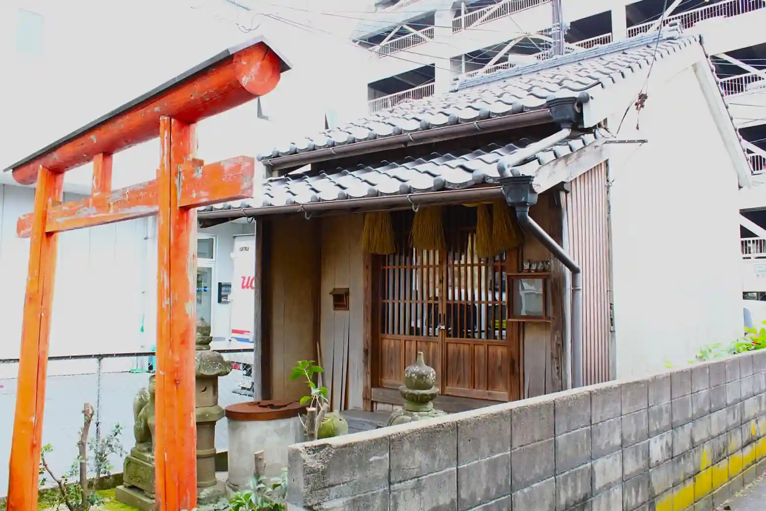周辺は商店街や飲み屋街であり、その間の狭い路地の先の袋小路に鎮座されています。昔より周囲のお店から商売繁盛として崇められ現在に至るものかもしれません。建物は社殿っぽく見えませんので、雨風が凌げるよう中に小祠があるのかも。